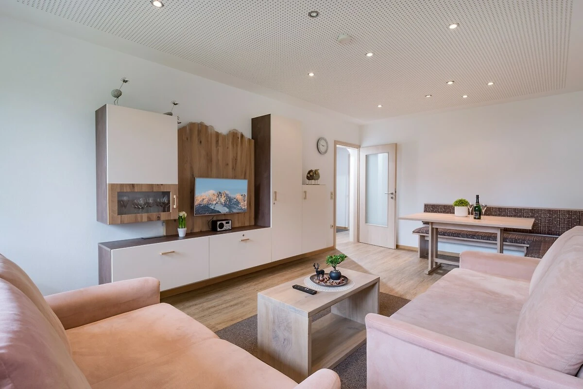 Gemütliche Zweizimmerwohnung mit Blick nach Süden auf das Kaisergebirge (56 qm, 2 bis 4 Personen) mit gemütlicher Eckbank und einer Schlafcouch. Das Schlafzimmer ist mit einem Doppelbett und Kleiderschrank ausgestattet, das Bad mit WC und begehbare Dusche. Die Küche bietet einen 4 Plattenherd, Backofen,Spülmschine, Kühlschrank, Mikrowelle, Kaffeemaschine und Toaster sowie alle nötigen Kochutensilien.
