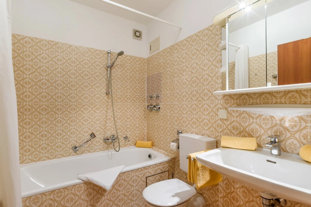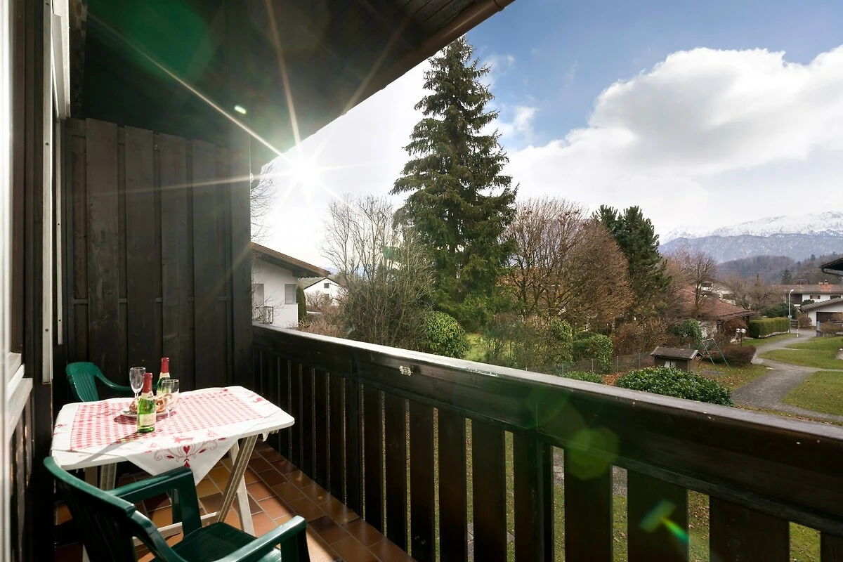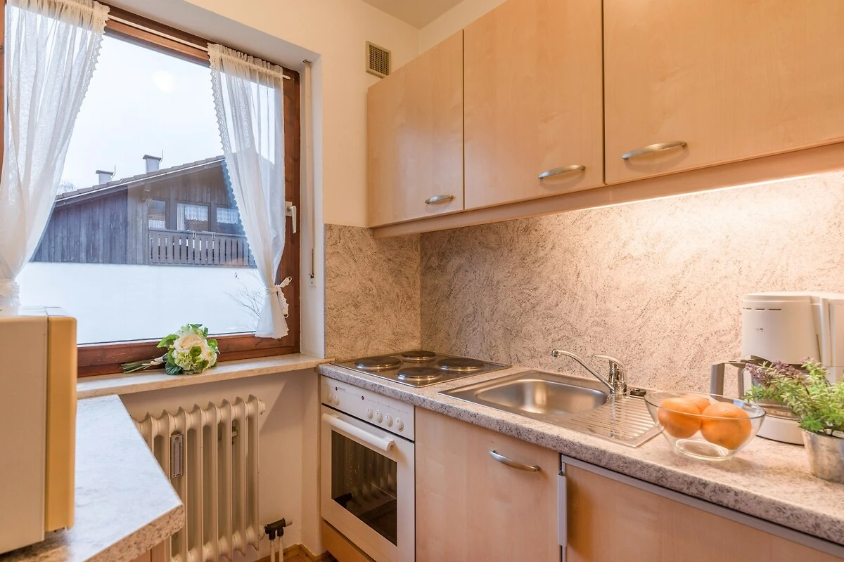 Gemütliche Zweizimmerwohnung mit Blick nach Süden auf das Kaisergebirge (56 qm, 2 bis 5 Personen) mit gemütlicher Eckbank und einer Schlafcouch. Wohnzimmer mit Eckbank, Schlafcouch und Fernseher. Schlafzimmer mit Doppelbett, einem Einzelbett und Kleiderschrank. Bad mit WC und Wanne. Küche mit 4 Plattenherd und Backofen, Kühlschrank, Mikrowelle, Kaffeemaschine und Toaster.
