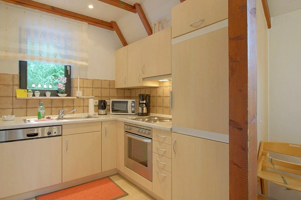 In der Küche ist ebenfalls an alles gedacht. Herd mit Backofen, Mikrowelle, Kaffeemaschine, Kühlschrank mit Gefrierfach,