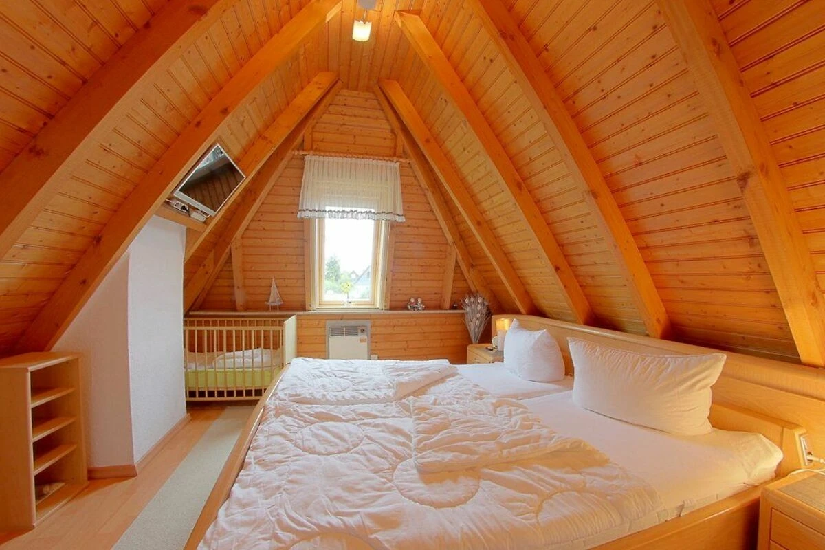 Im Obergeschoss befinden sich 2 Schlafzimmer, eines mit Doppelbett, Babybett und TV und Verdunkelung incl. Fliegengitter.