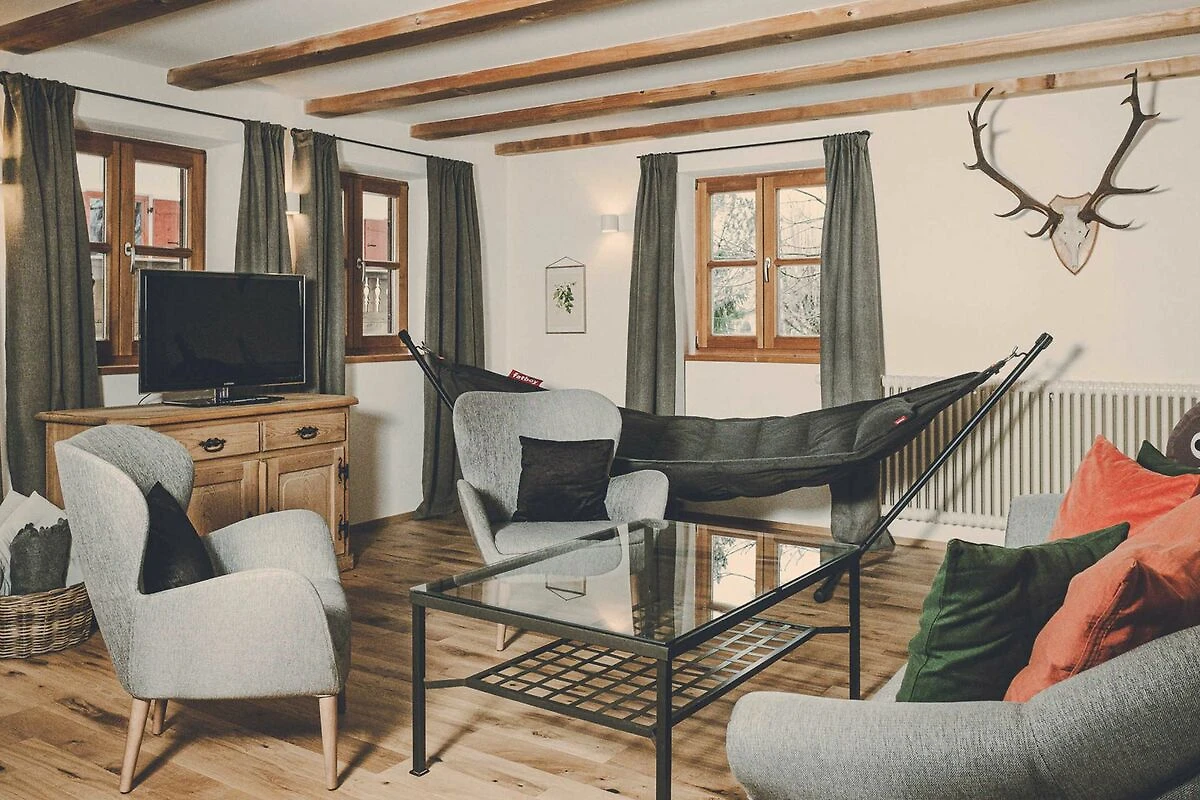 Im Haupthaus mit Rezeption und Frühstücksraum befinden sich unsere 3 grossen, neu ausgestatteten Maisonettewohnungen mit 2-3 Schlafzimmern sowie unser 3-Zimmer-Apartment Hochsitz mit 2 Schlafzimmern und einem eigenen Eingang.
