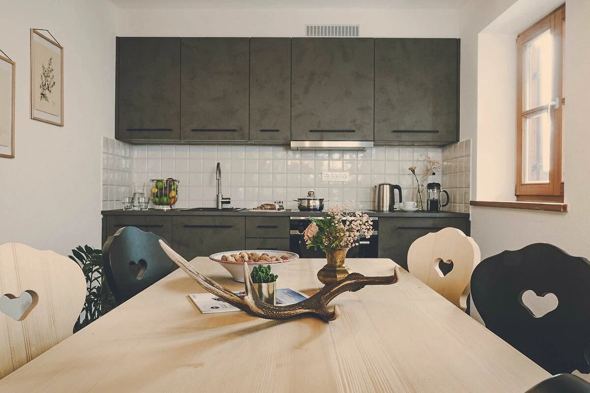 All unsere renovierten Apartments verfügen über neue, hochwertige Eichenböden. Die Küchenzeilen und Bäder wurden generalsaniert. Besonders freuen wir uns über unsere neuen Fichtenbetten, die von hiesigen Schreinern angefertigt wurden. Für den besten und nachhaltigen Schlaf haben wir uns für hochwertige Coco-Mat Naturmatratzen entschieden. Holz, Grün- und Grautöne dominieren.