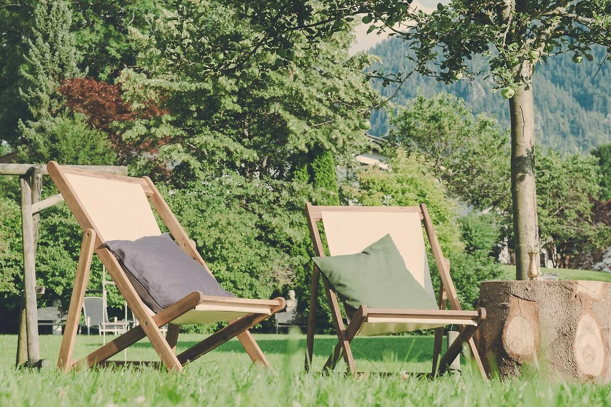 In unserem grossen Garten findest du Sonnenliegen, unsere tolle Hüttensauna, alten Baumbestand und einen Spielplatz.