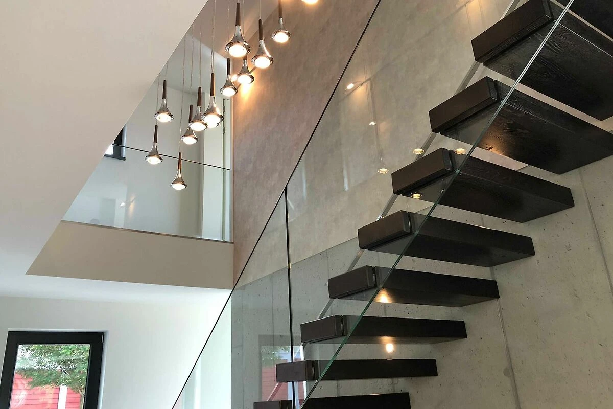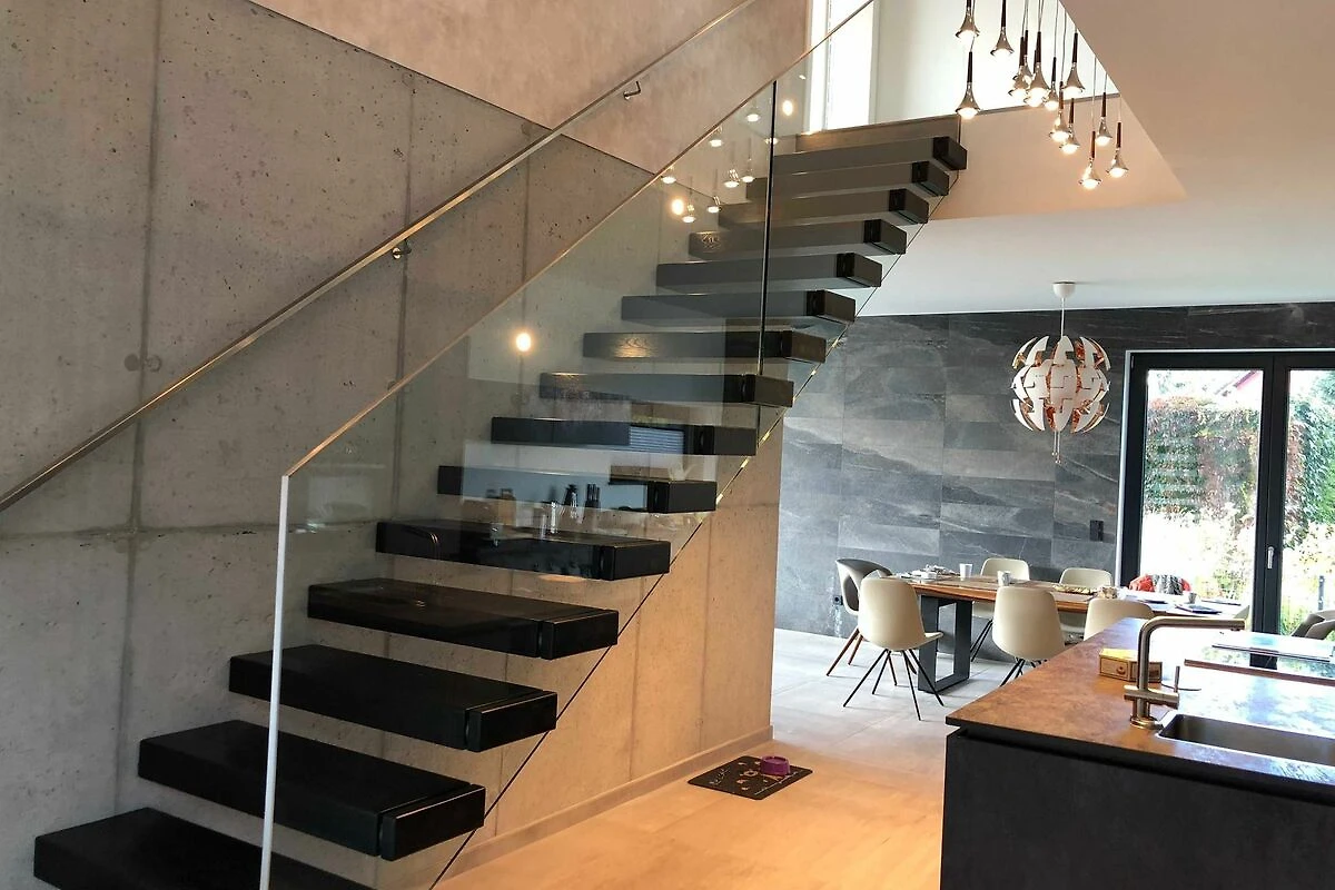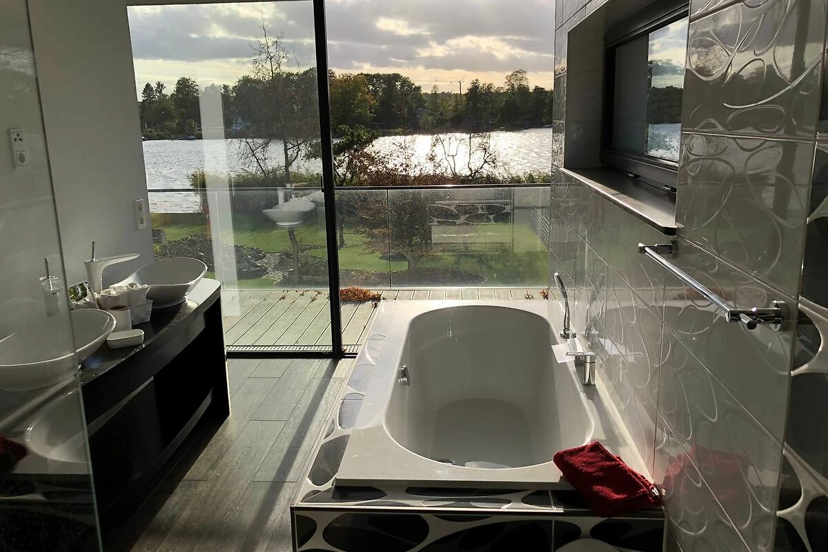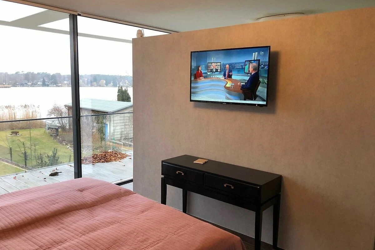 In Anlehnung an den Bauhausstil wurde das exklusive Haus seeseitig mit boden- und deckenhohen Fenstern und Glasschiebetüren errichtet.