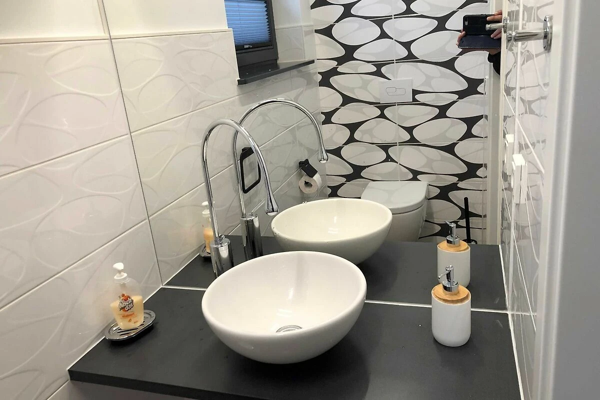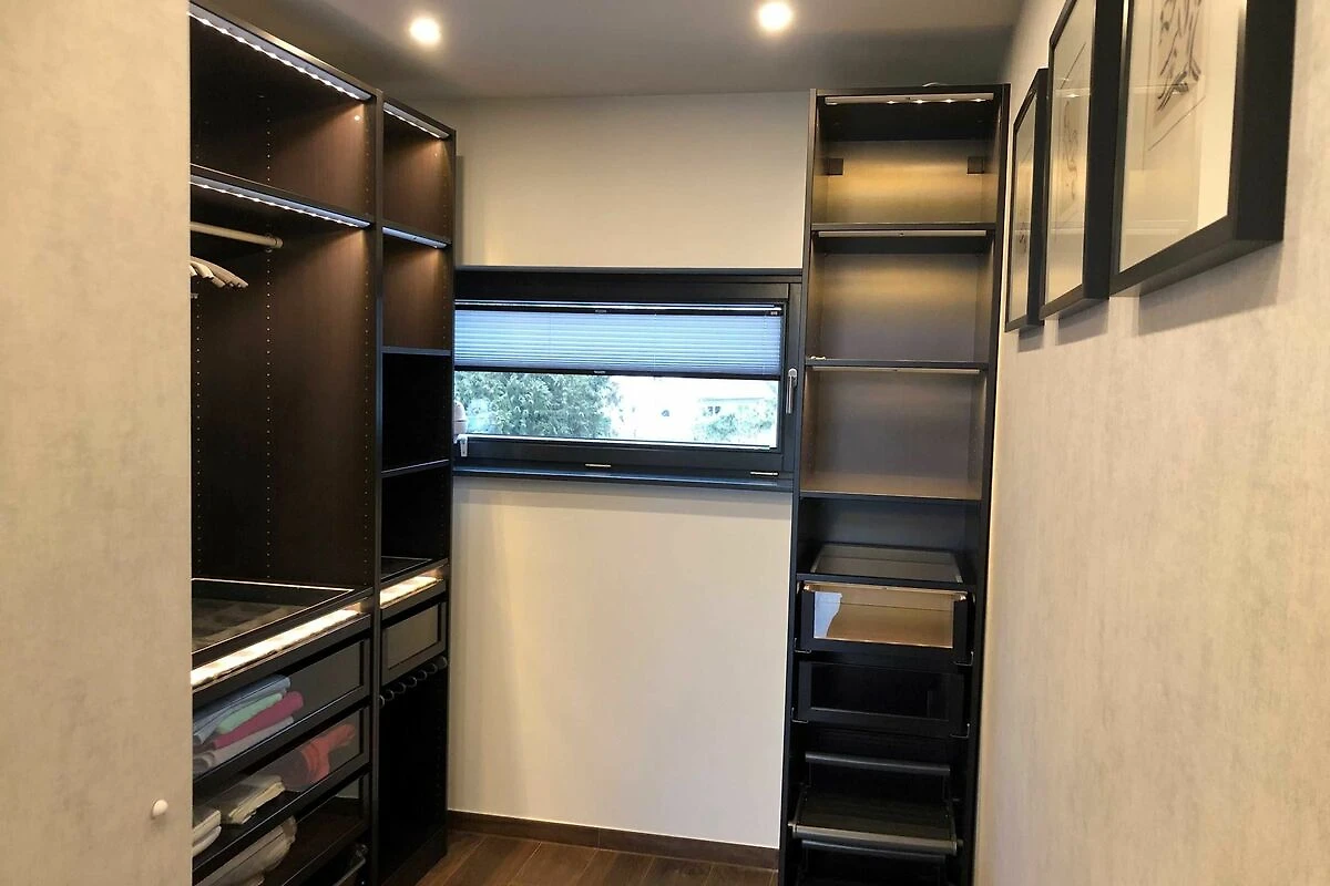 Im Erdgeschoss befinden sich ein Flurbereich mit grossen Garderobenschränken sowie ein Gäste Bad mit WC, Dusche, Waschplatz und Waschmaschine.