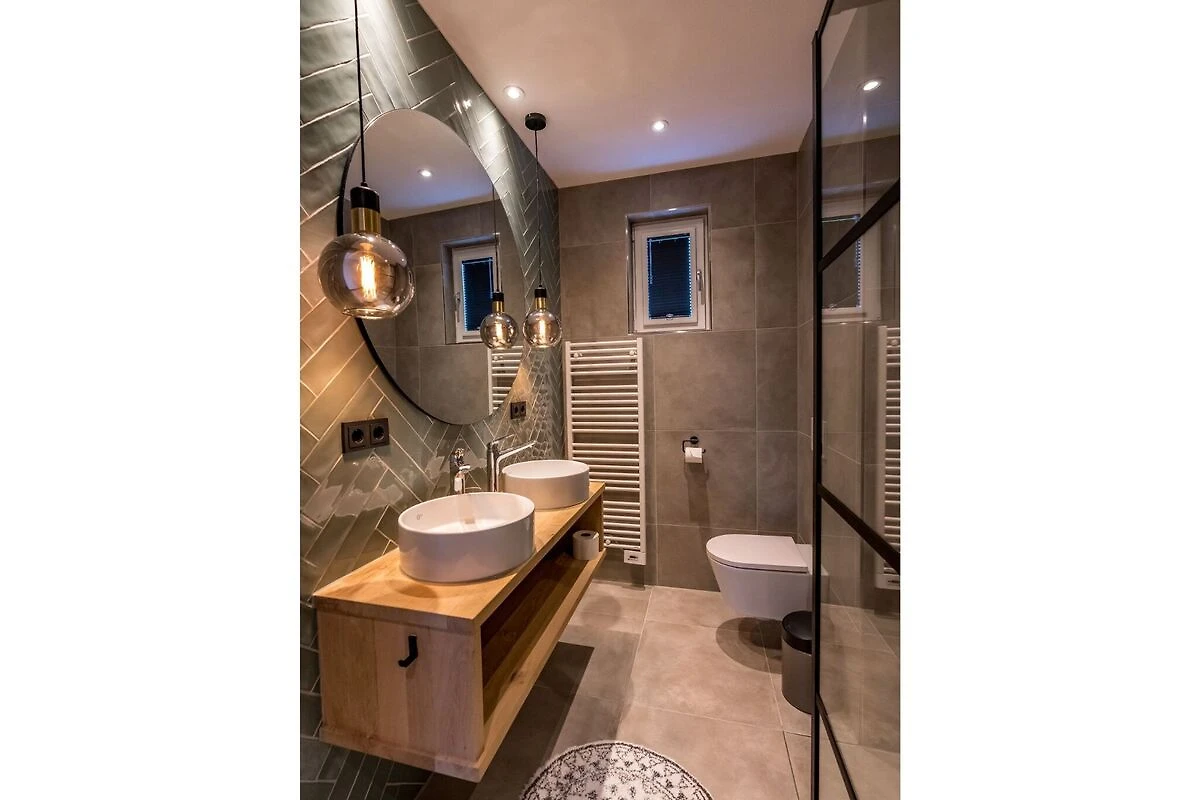 In der 1. Etage: (Schlafzimmer(Einzelbett(Boxspring), Einzelbett(Boxspring), TV(smart TV), Waschbecken), Schlafzimmer(Einzelbett(Boxspring), Einzelbett(Boxspring), TV(smart TV), Waschbecken), Badezimmer(Dusche, Waschbecken, Toilette))
