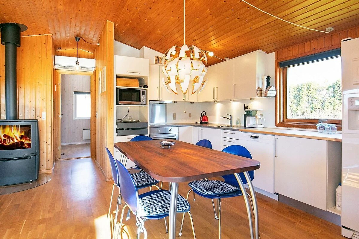 Offene Küche(Kochherd(elektrisch), Dunstabzugshaube, Kaffeemaschine, Mikrowelle, Spülmaschine, Kühlschrank, Tiefkühlschrank(60-99L)), Wohn-/Schlafzimmer(TV(Deutsch Fernsehsender, dänische Fernsehsender)), Schlafzimmer(Doppelbett), Schlafzimmer(Doppelbett), Schlafzimmer(2x Einzelbett), Badezimmer(Badewanne oder Dusche, Waschbecken, Toilette, Waschmaschine), Heizung(elektrisch), Terrasse, Garten, Grill, Fischreinigungstisch, Luft-Luft-Wärmepumpe