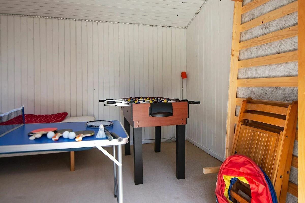, offene Küche(Kochherd(elektrisch), Dunstabzugshaube, Kaffeemaschine, Spülmaschine, Kühl-/Gefrierkombination), Wohn-/Schlafzimmer(TV(Deutsch Fernsehsender, dänische Fernsehsender), CD-Spieler, Stereoanlage), Schlafzimmer(Doppelbett), Schlafzimmer(Doppelbett), Schlafzimmer(Doppelbett, 2x Etagenbett), Badezimmer(Badewanne oder Dusche, Waschbecken, Toilette, Waschmaschine), Heizung(elektrisch), Terrasse, Terrasse(überdacht), Grill, Tischtennisplatte, Tischfußball, Fußballtor, Luft-Luft-Wärmepumpe