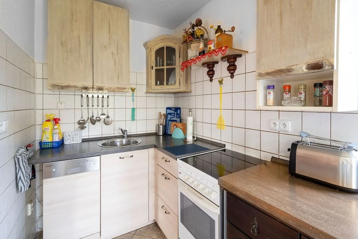 Parterre: (Küche(Herd, Wasserkocher, Toaster, Kaffeemaschine, Backofen, Spülmaschine, Kühl-/Gefrierkombination, Waschbecken), Wohn/Esszimmer(TV, Esstisch, Kaminofen, Sitzecke, Radio), Badezimmer(Dusche, Waschbecken, Toilette))