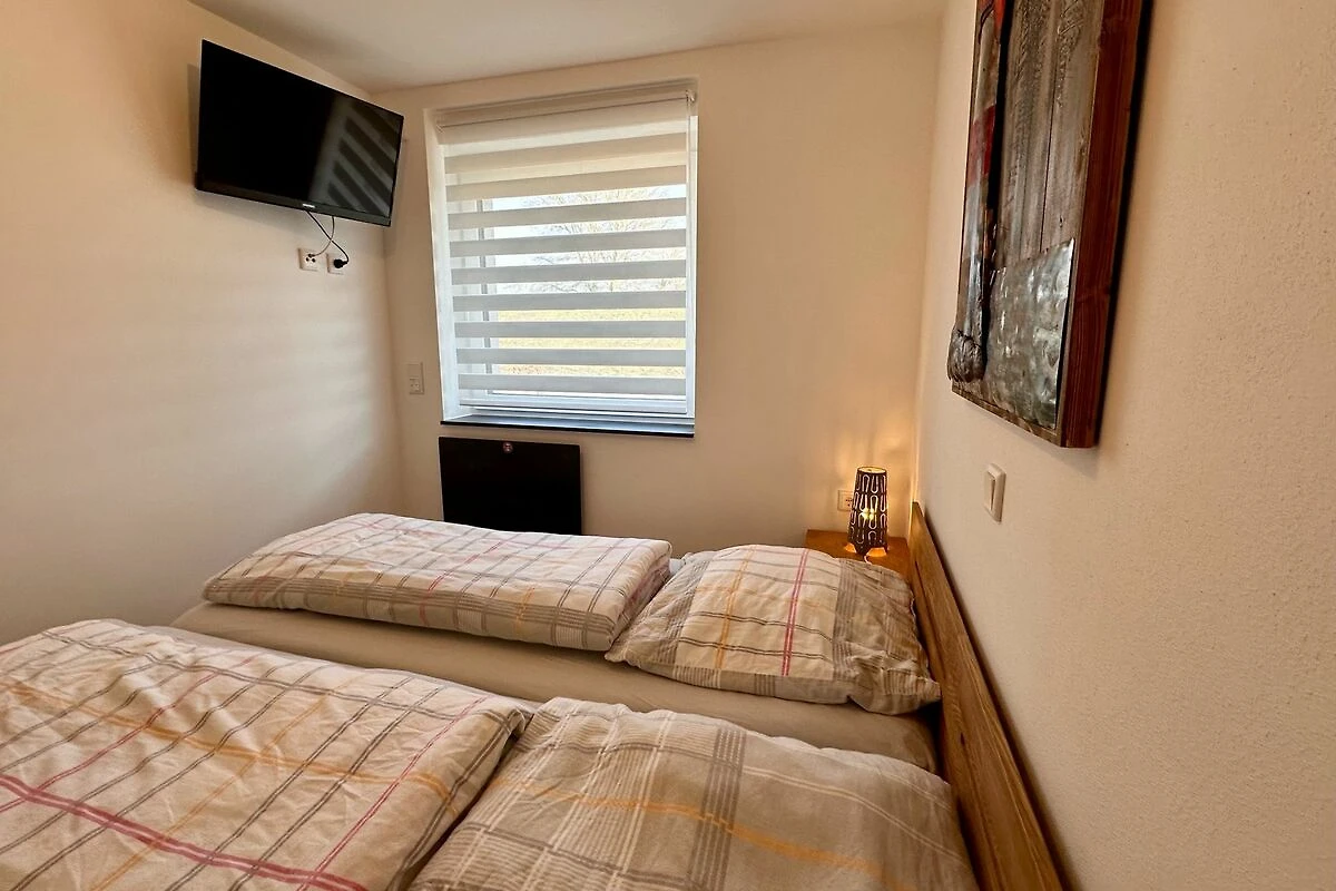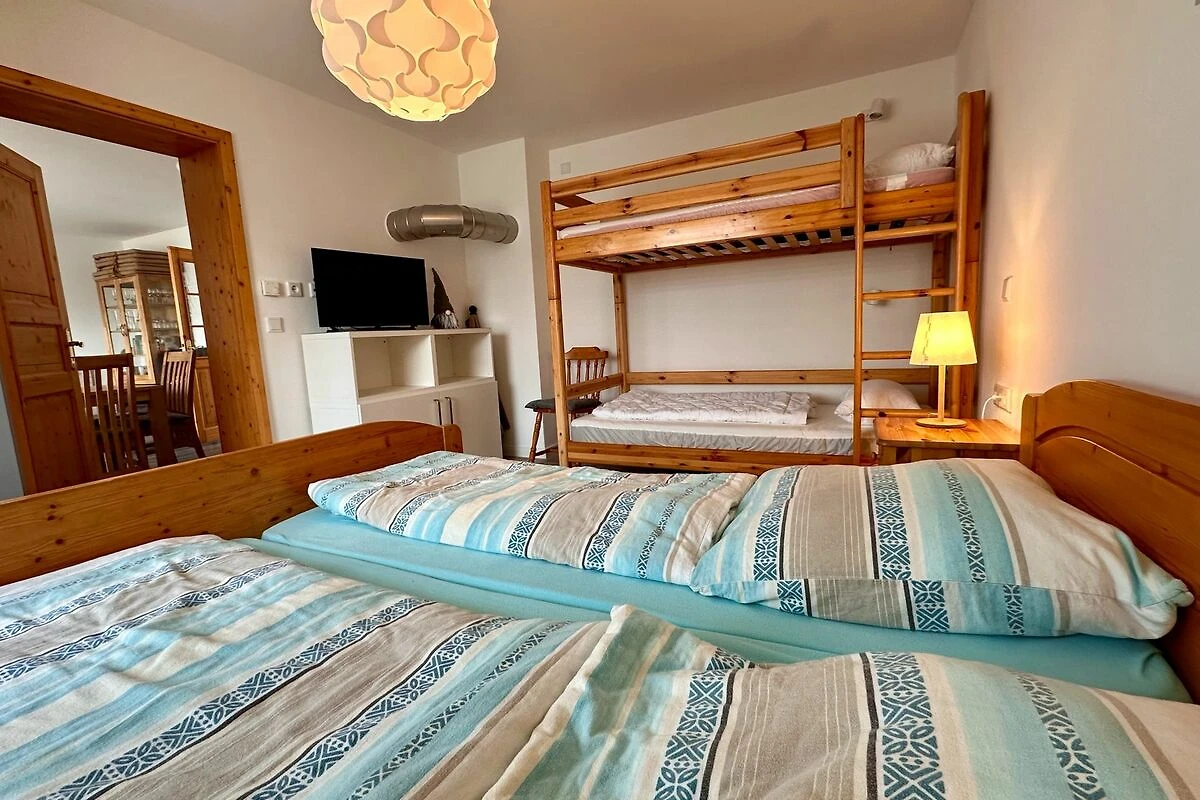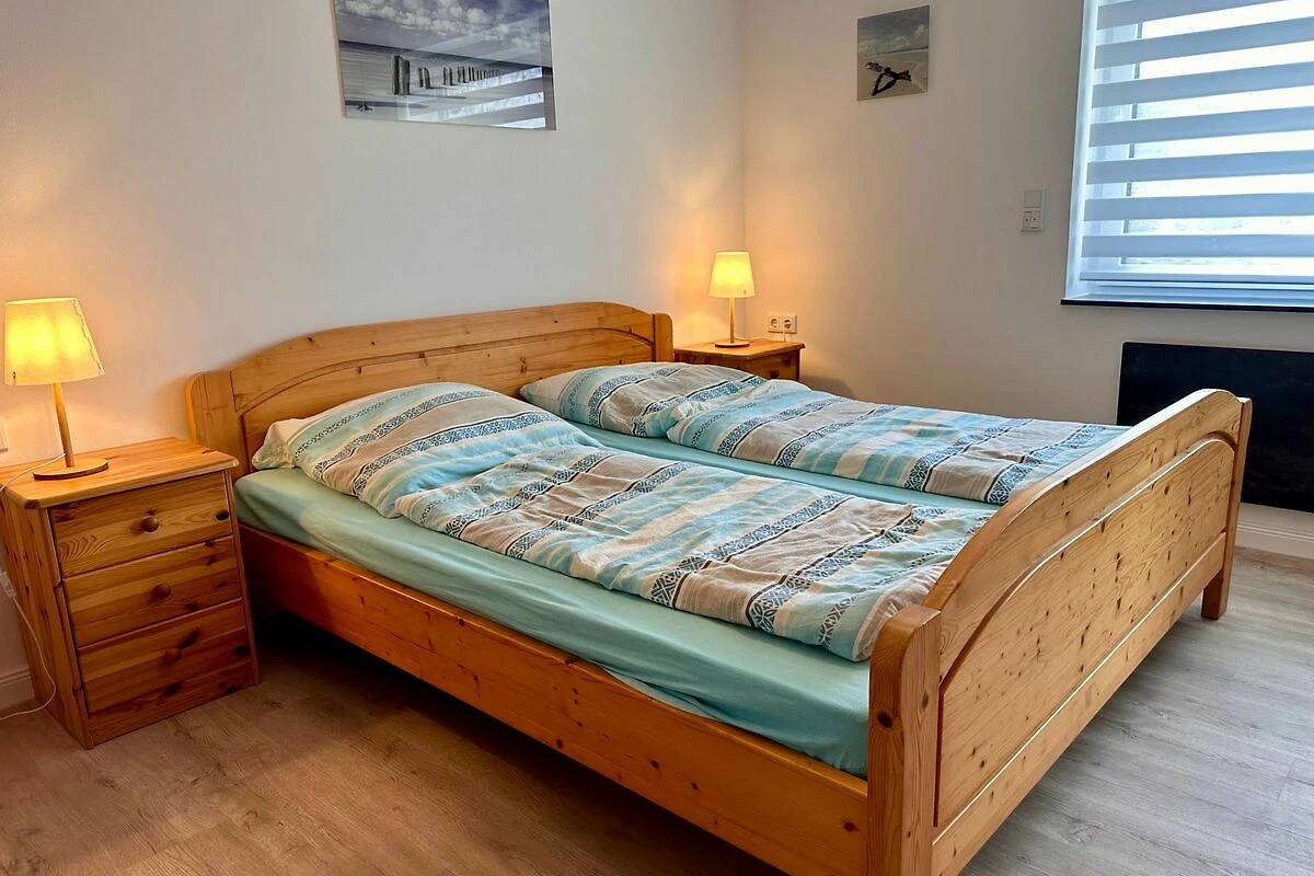 Ein gemütliches Wohnzimmer mit TV, Radio, CD-Player und Ofen lädt nach einem Tag am Meer zum Entspannen ein. Schlafzimmer 1 bietet ein Doppelbett (2 x 90x200 cm), ein Etagenbett und einen weiteren TV – perfekt für Reisen mit Kindern. Im zweiten Schlafzimmer stehen ebenfalls ein Doppelbett (2 x 90x200 cm) und ein TV bereit. Die Wohnung ist eine Nichtraucherunterkunft. In der voll ausgestatteten Küche können Sie ganz entspannt selbst kochen: Ceran-Herd mit Backofen, Mikrowelle, Spülmaschine, Kühlschrank mit Gefrierfach, Kaffeemaschine, Wasserkocher, Toaster sowie Geschirr, Besteck und ein Esstisch für gemeinsame Mahlzeiten sind vorhanden.