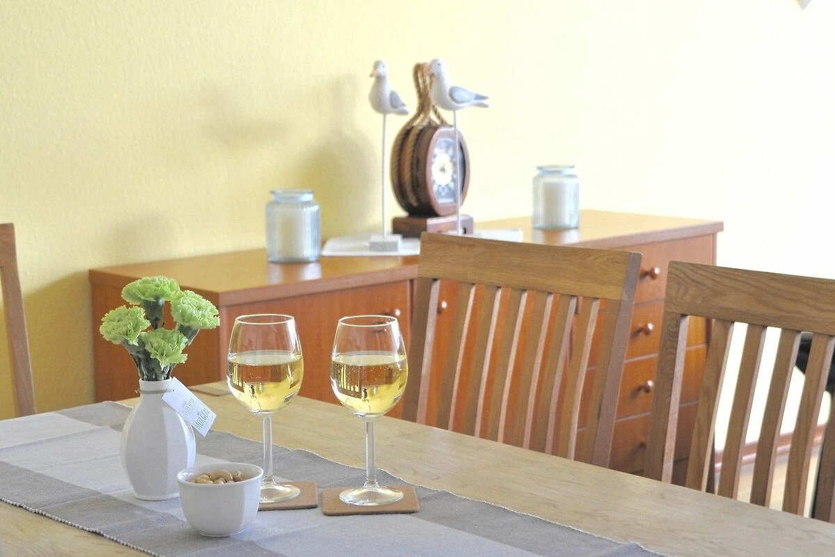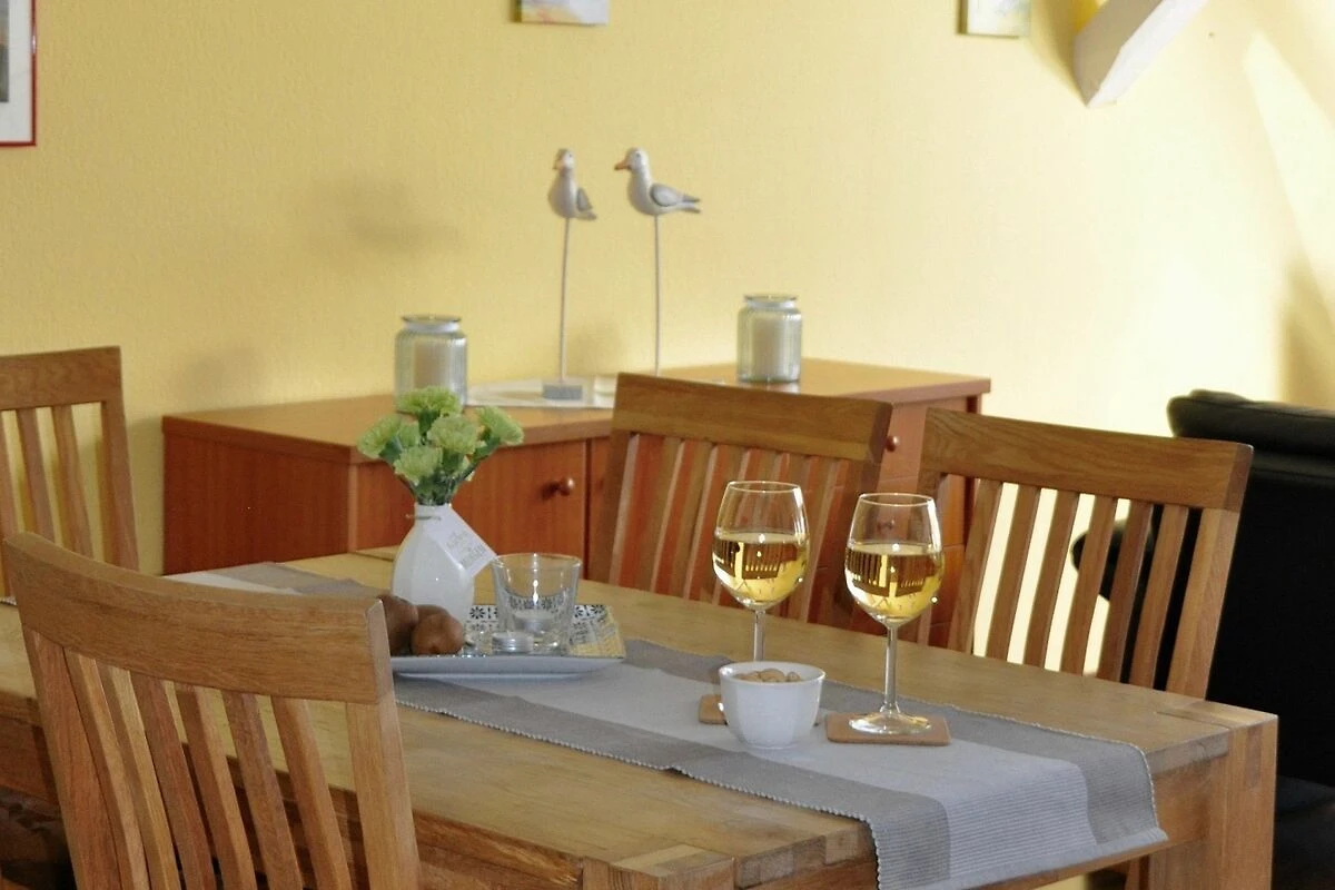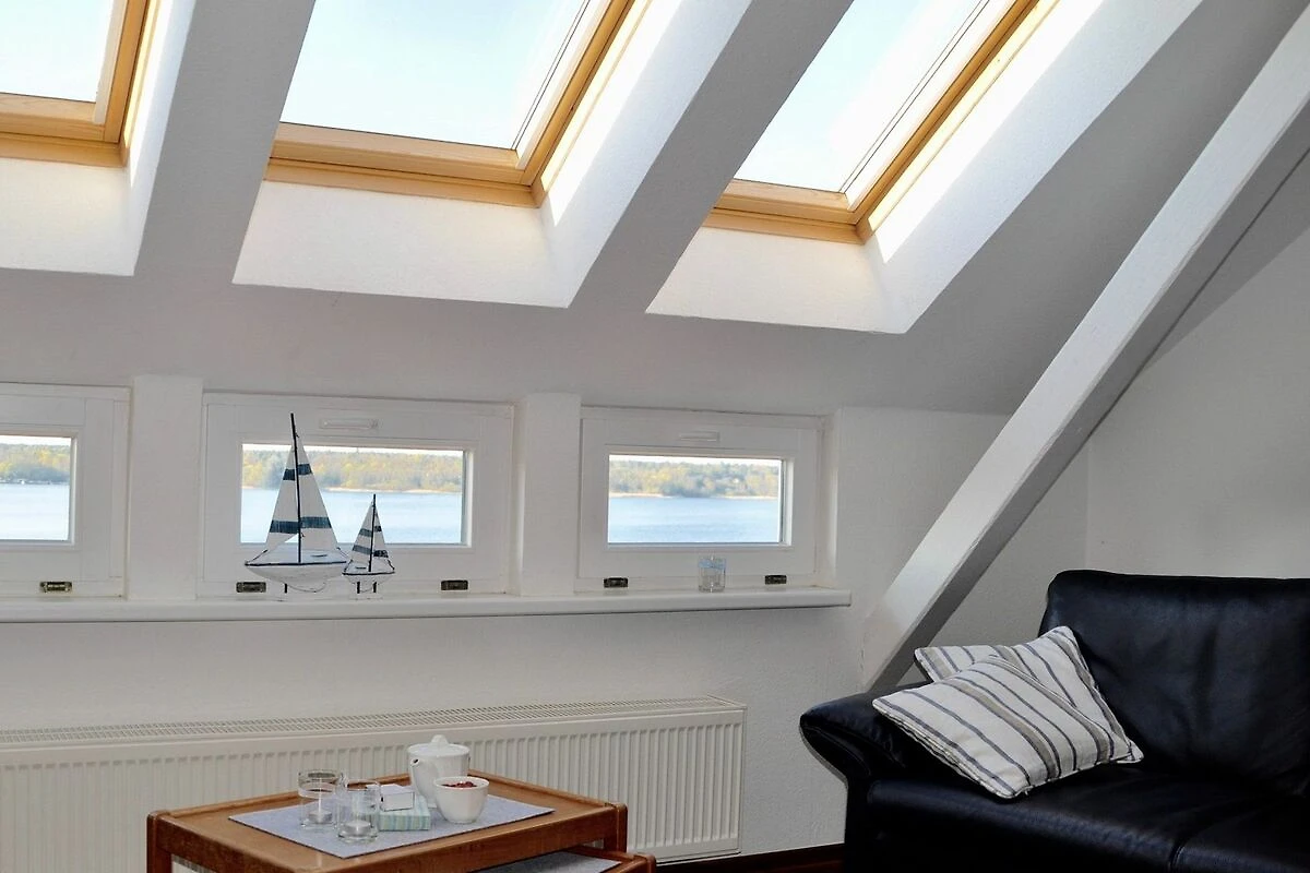 Vier Personen können am grossen Esstisch im Küchenbereich platz nehmen. Vom Wohnzimmer und oberen Schlafzimmer haben Sie einen sehr schönen Ausblick auf das Wasser und die Umgebung.