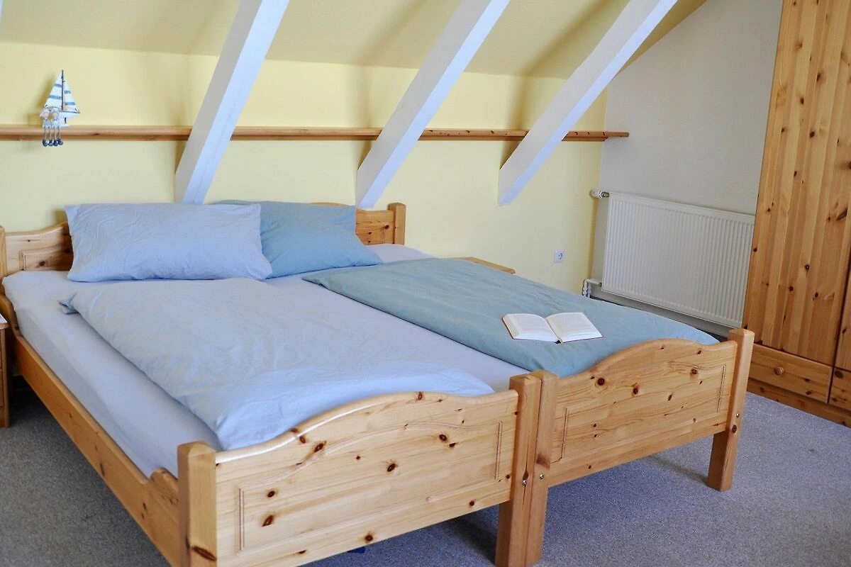 Das Schlafzimmer im oberen Stockwerk verfügt über ein Doppelbett und im Schlafzimmer im Erdgeschoss findet man ein Etagenbett, für die kleinen Gäste sehr geeignet, vor.