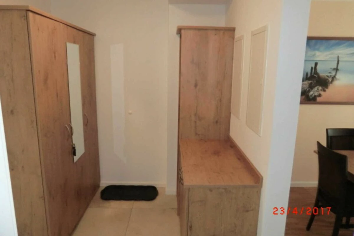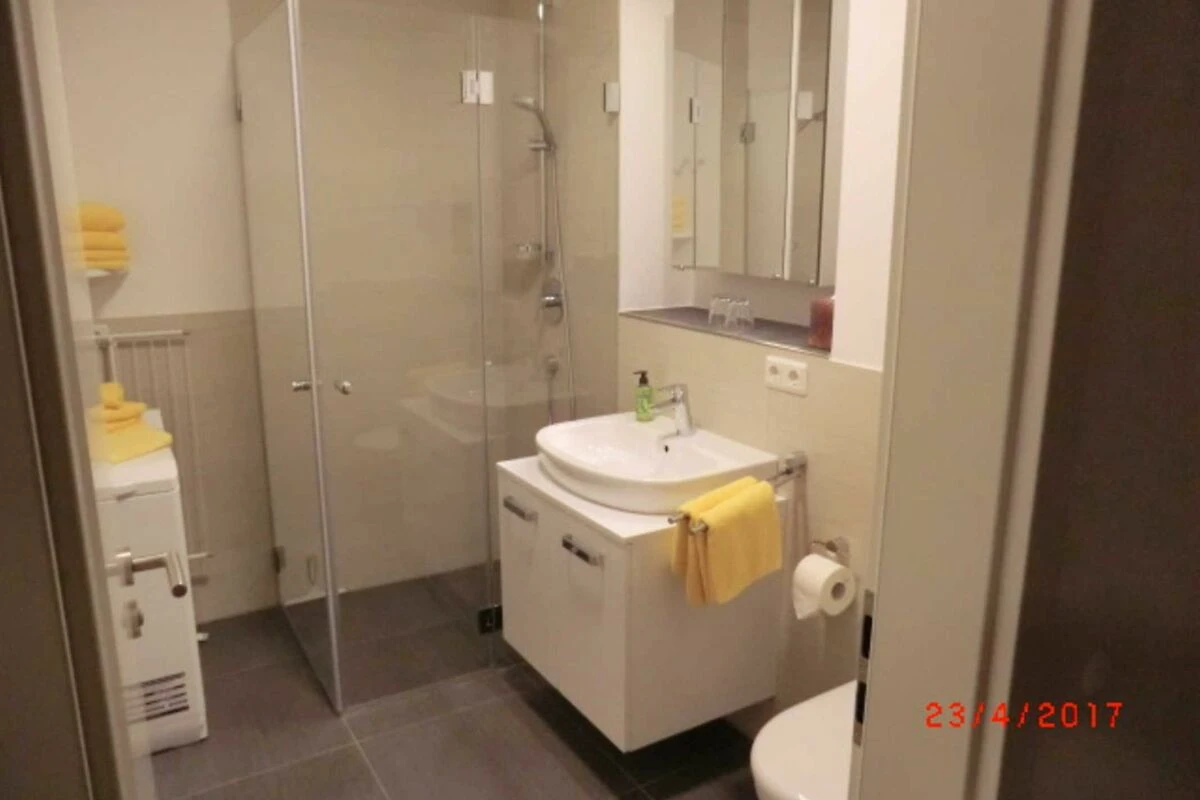 Beim Eingang, befindet sich der Garderobenbereich mit Schränken, Schuhabstellschale und ein Desinfektionsmittelspender. Von hier geht man auch ins das Bad, das mit einer ebenerdigen Dusche (Glasduschwände), 1 WC, 1 Waschbecken, 1 Waschmaschine und einer elektr. Handtuchheizung ausgestattet ist. Vorhanden sind hier natütlich auch Zahnputzbecher, Haarföhn, Handtücher, Badetücher, Fussbodentuch und für die ersten Tage auch WC- Papier.