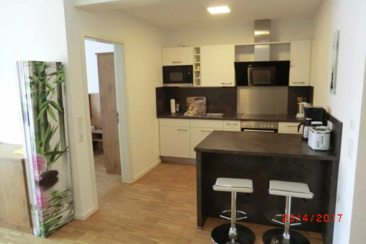 Küche: Mit Kühlschrank (mit Gefrierfach), Mülltrennungs-Unterschrank, Backherd, Ceranfeld, Spülmaschine u. Spülbecken, Microwelle mit Abdeckhaube, Dunstabzug (Umluft), Geschirr un Gläser aller Art, ausreichend Besteck, Töpfe, Pfannen, Schüsseln uvm. Kaffemaschine (für den Anfang ist Filter u. Kaffe da) , Wasserkocher, Toaster usw.