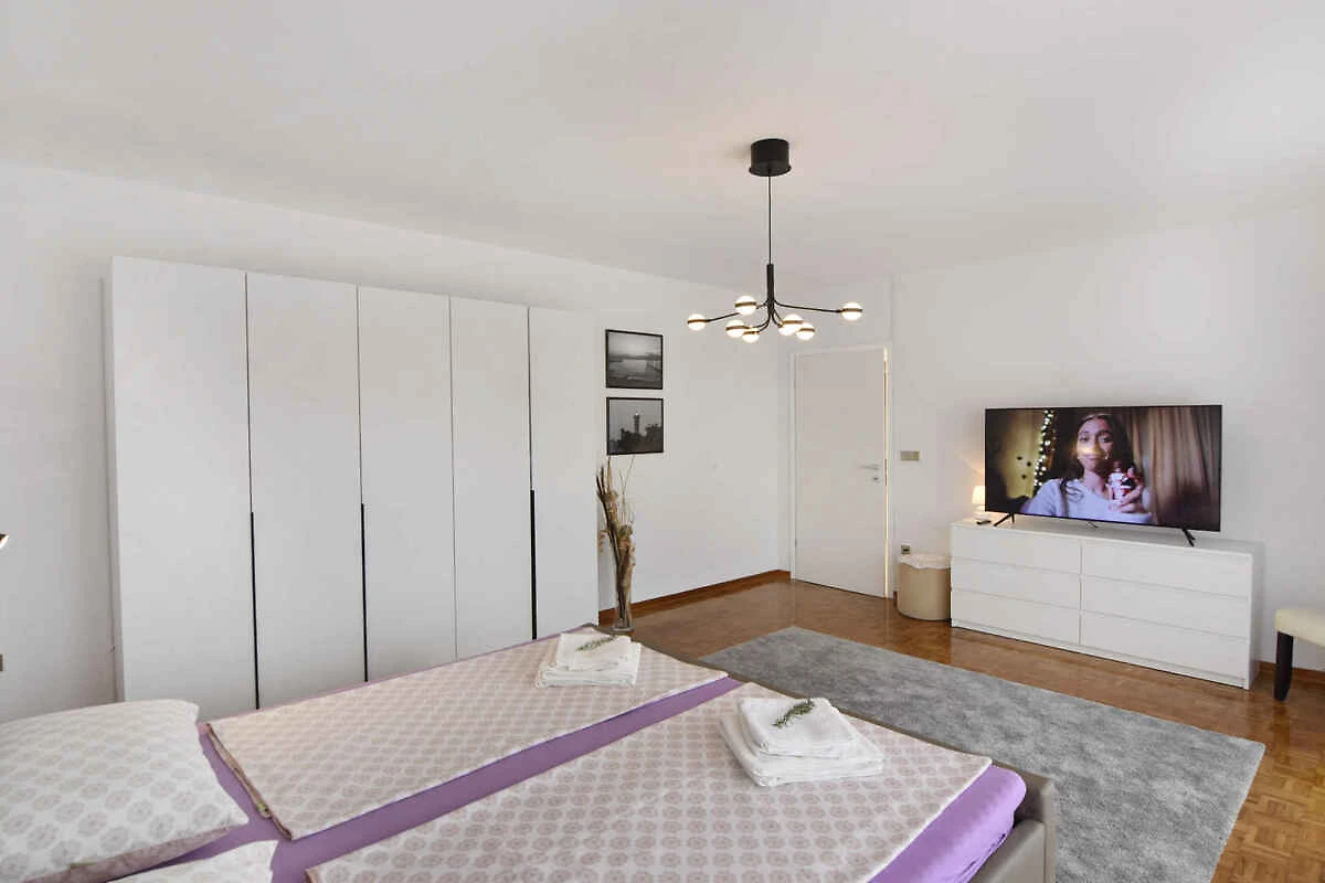 Umag. Die Ferienwohnung befindet sich auf einem geschlossenen Grundstück mit Blumen und Bäumen, von einem Zaun begrenzt. Der Vermieter wohnt ständig im Haus, nutzt jedoch einen separaten Eingang. Die Zufahrt erfolgt über eine Nebenstrasse (asphaltiert). Parkplatz auf der Strasse vor dem Haus.