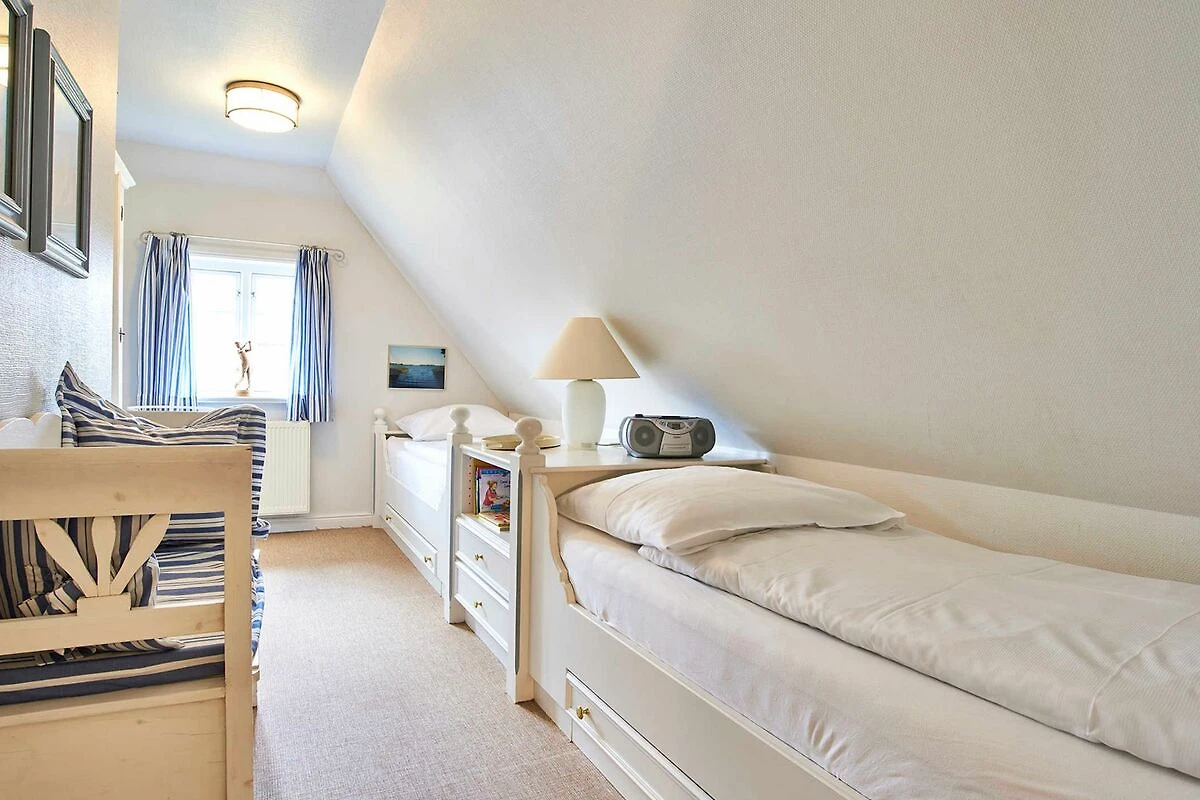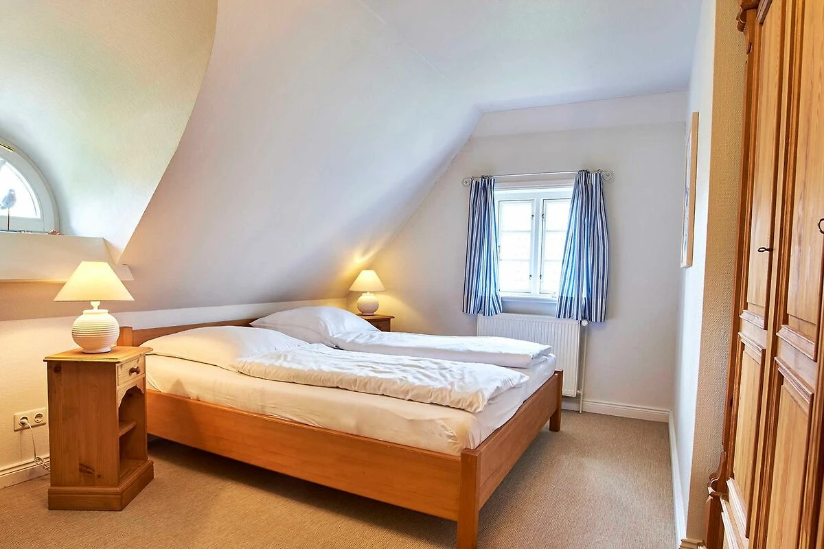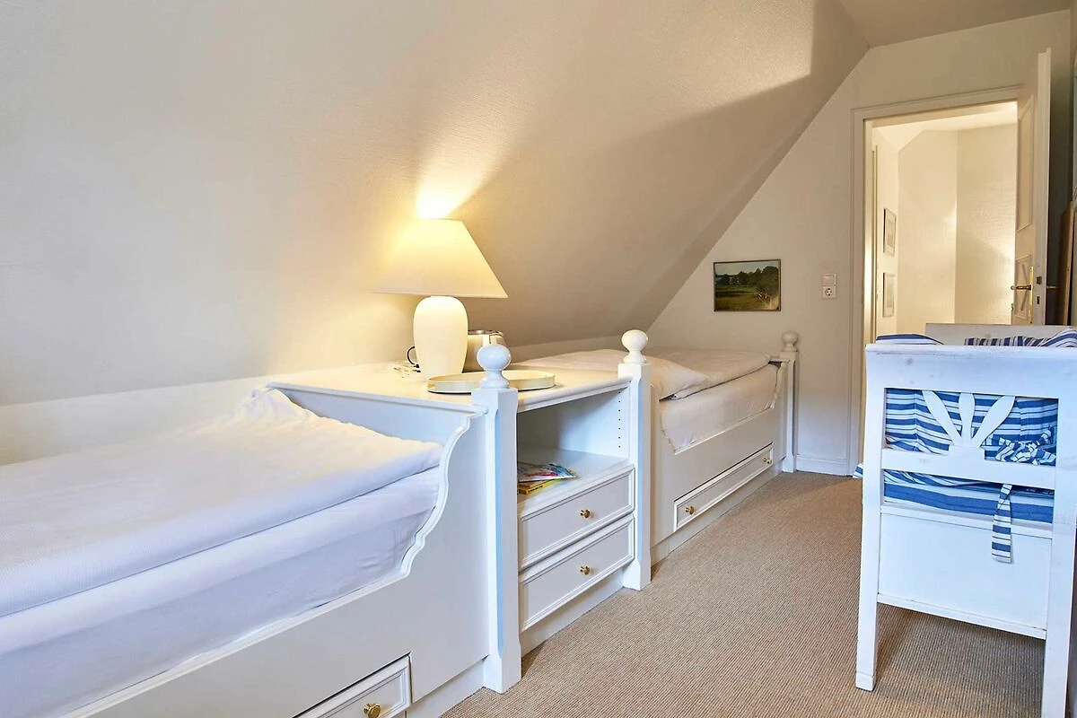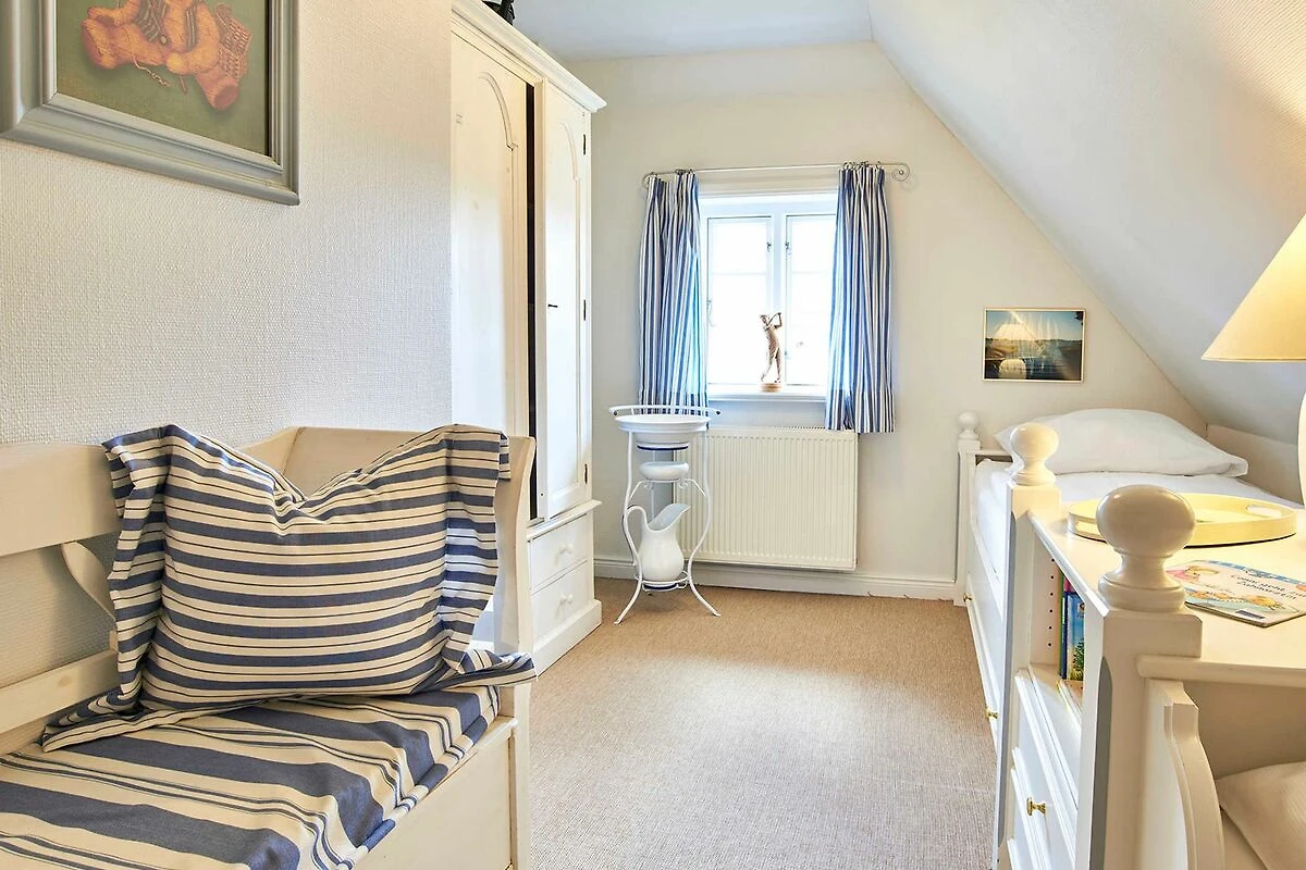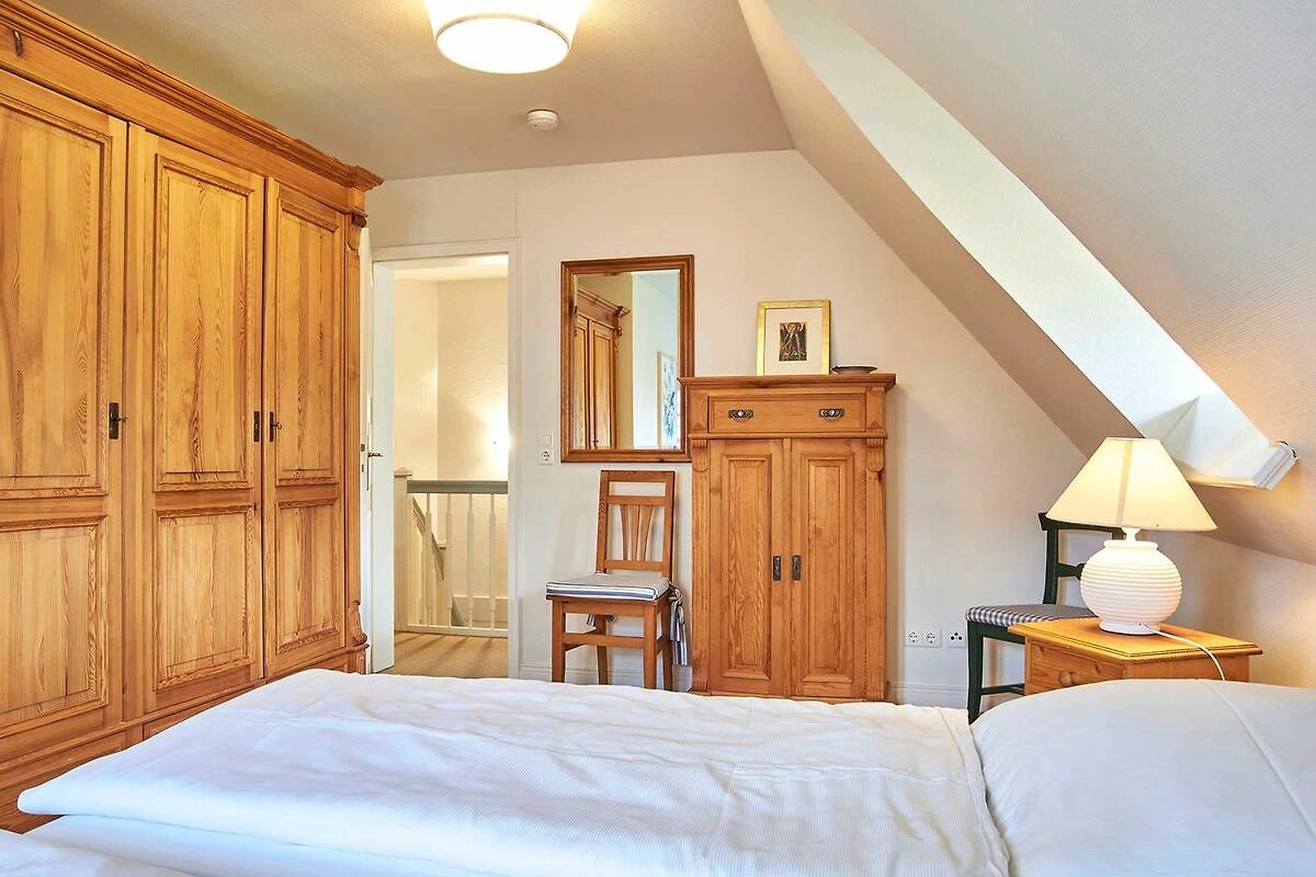 Das Obergeschoss verfügt über zwei Schlafzimmer: 1 Doppelbett im Elternschlafzimmer, 2 Einzelbetten im Stil von Alkoven im Kinderzimmer sowie eine kleine Spielgalerie im Flur laden zum Verweilen ein. Das Duschbad ist mit WC ausgestattet. Das gesamte Mobiliar ist hochwertig und sehr liebevoll zusammengestellt. Auf der Süd-Terrasse, mit bequemen Möbeln und Strandkorb, kann man die Stunden im Freien geniessen. Dabei wünschen wir Ihnen bereits jetzt viel Vergnügen und hoffen, dass die Nordseeluft und das Wetter dazu beitragen!