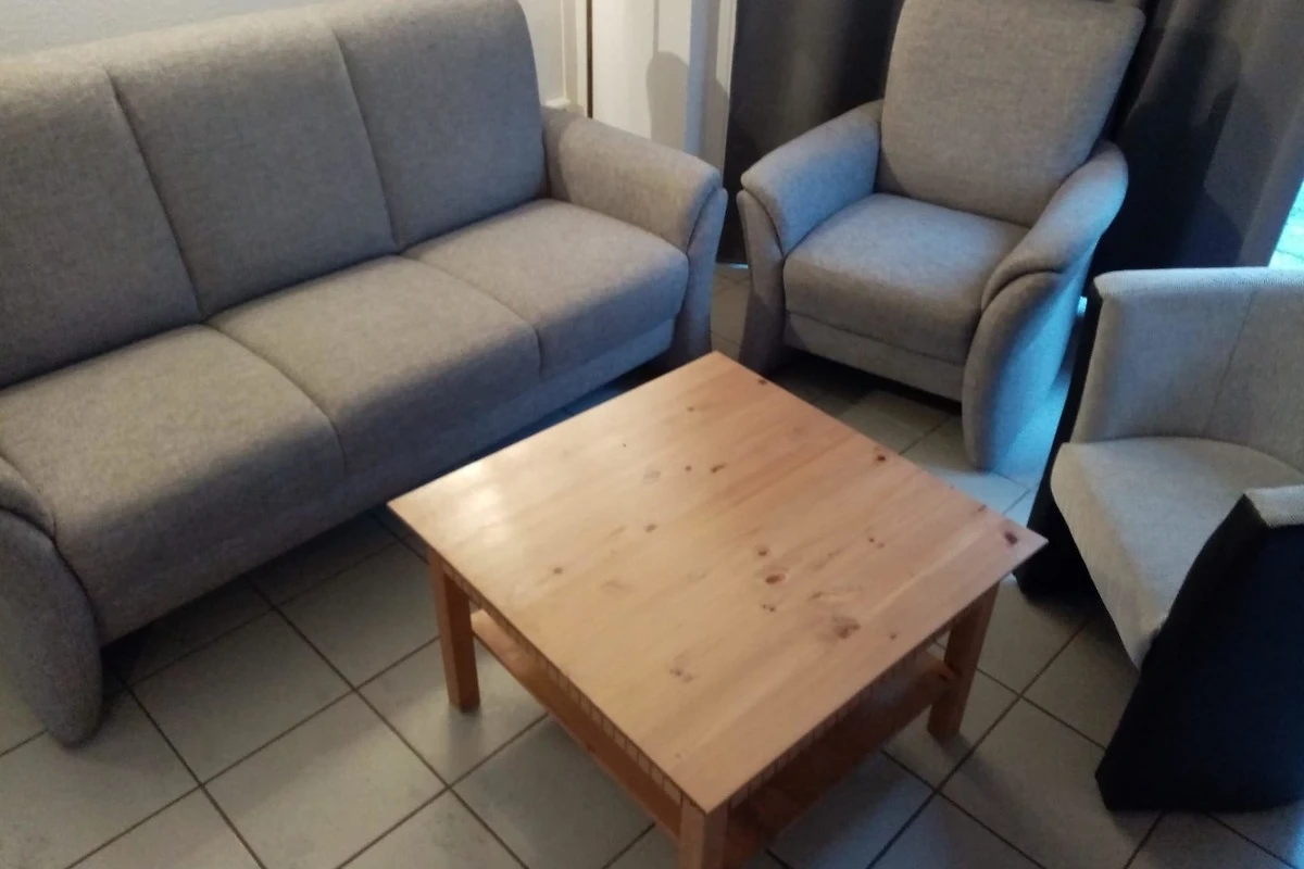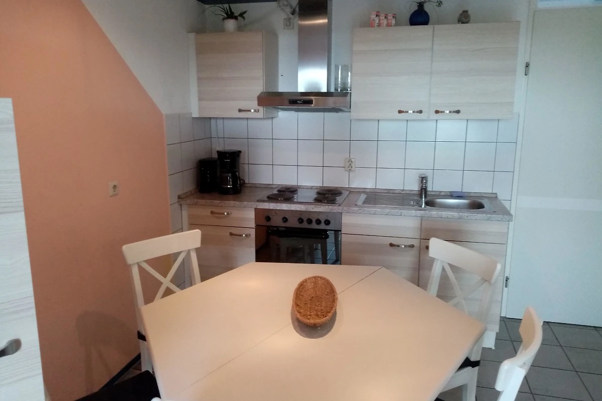 Es erwartet Sie eine komplett eingerichtete Küchenzeile mit 4-Platten-Herd, Kühlschrank, Kaffeemaschine, Wasserkocher, Toaster und sämtlichem Inventar sowie eine Essecke für bis zu 6 Personen.