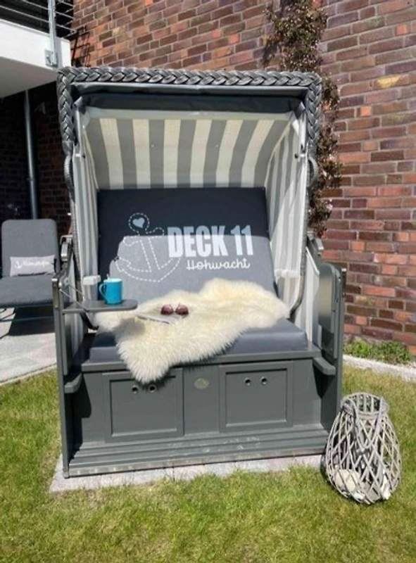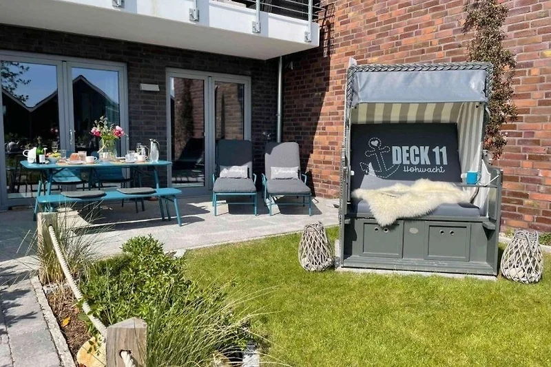 Die Ferienwohnung „DECK 11“ besticht durch ihren grosszügigen Aussenbereich, der über eine vollständig möblierte Terrasse und einen charmanten Garten verfügt. Ein exklusiver Strandkorb im Garten bietet einen seitlichen Blick auf die Bucht, während der direkte Zugang zum Strand in nur wenigen Metern Entfernung verlockt.
