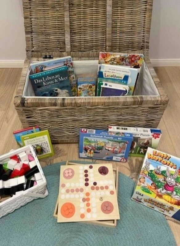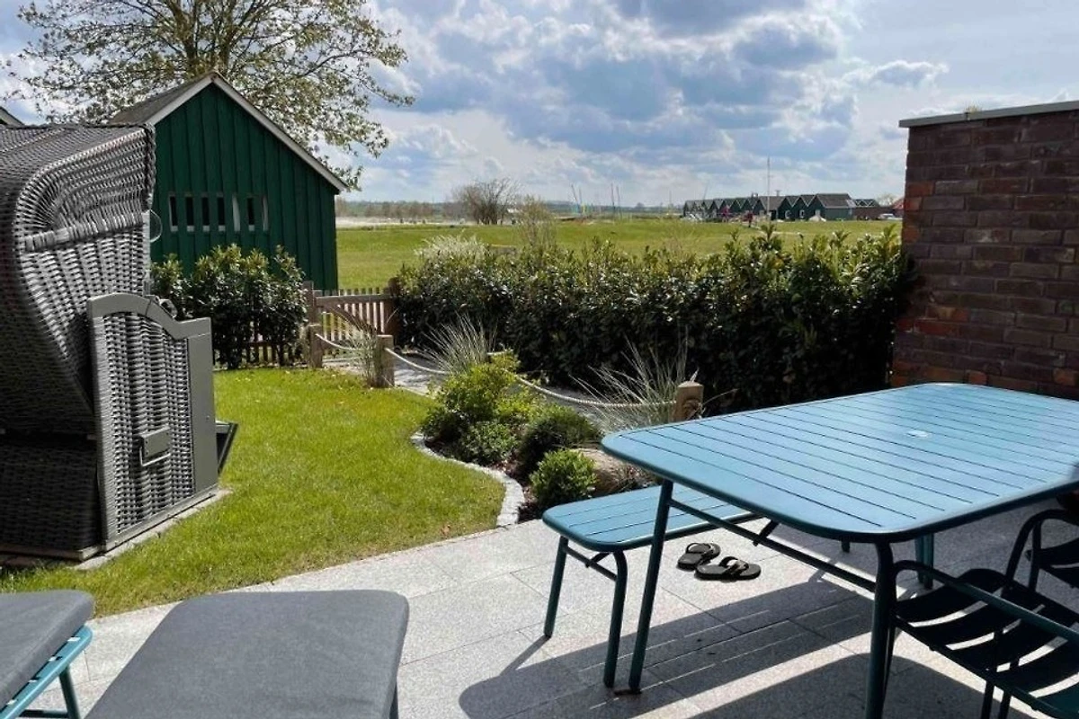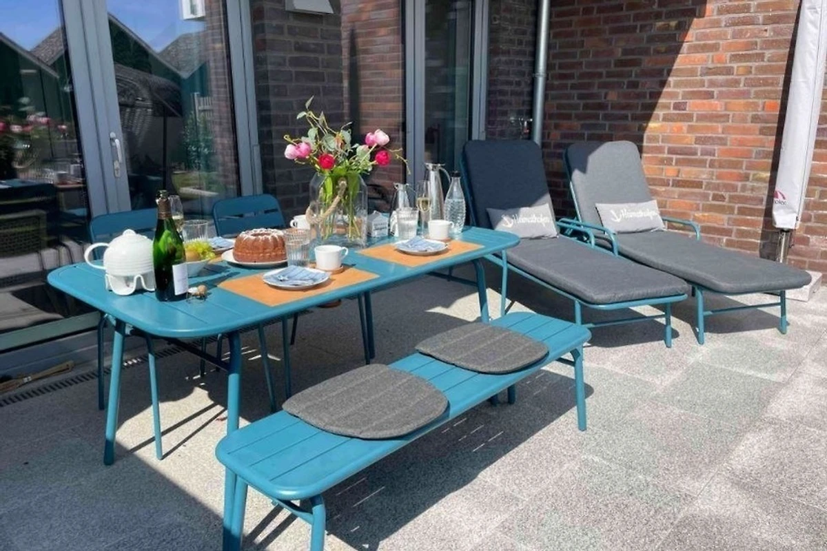 Besucher können die nach Südwesten ausgerichtete und windgeschützte Terrasse geniessen, die teils überdacht ist und viel Sonnenwärme speichert. Die Möblierung umfasst eine grosse Ess-/Sitzgruppe sowie Sonnenliegen mit Auflagen. In der Zeit vom 1. Mai bis 15. September steht zusätzlich ein privater Strandkorb am Strand zur Verfügung. Die Gartenpforte und Terrassentür lassen sich mit dem Wohnungsschlüssel abschliessen, um Sicherheit zu gewährleisten. Damit ist der Aussenbereich ideal für entspannte Tage an der Küste.