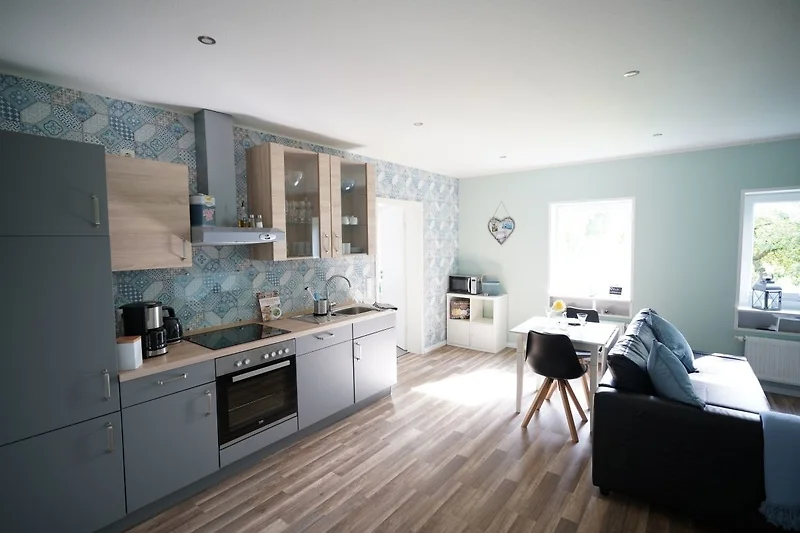 Wohnküche: Laminatboden, ausziehbares Schlafsofa, TV, Internetradio, Backofen, Herd, Wasserkocher, Toaster, Filter-Kaffeemaschine, Mikrowelle, Kühlschrank und Verdunklungsplissee