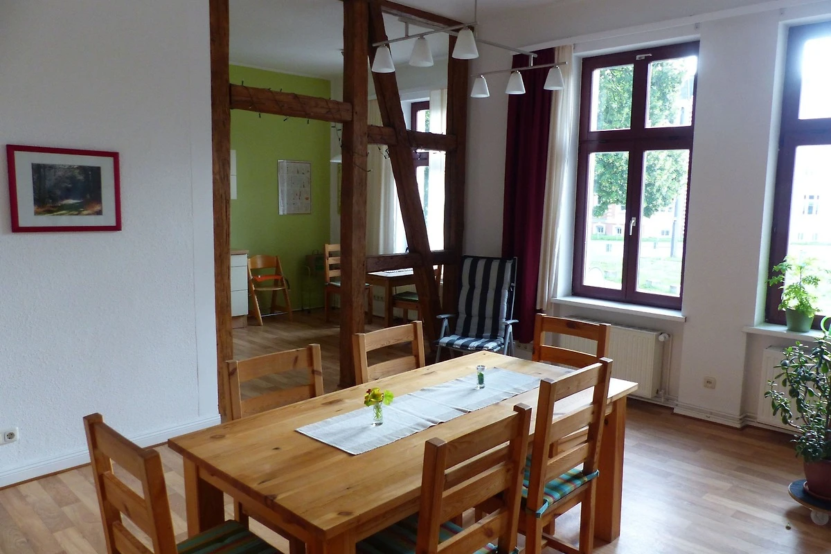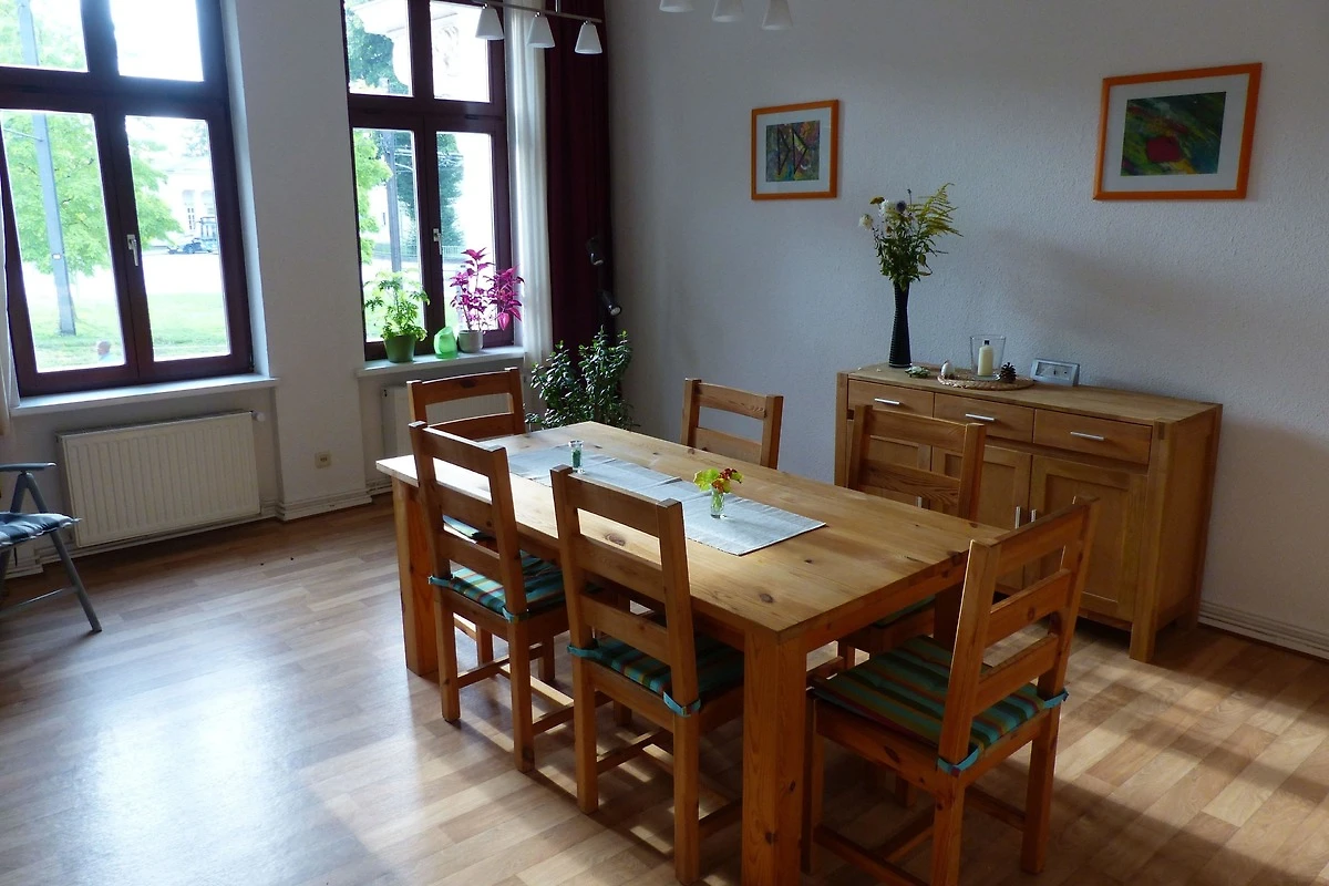 Die Ferienwohnung besteht aus einem Esszimmer mit Sicht in Richtung Schlossgarten und einer angrenzenden Wohnküche. An das grosse Wohnzimmer grenzt der geräumige Balkon mit Sicht in den Garten. Ein Schlafzimmer und ein Bad mit Vorflur ergänzen die Wohnung.