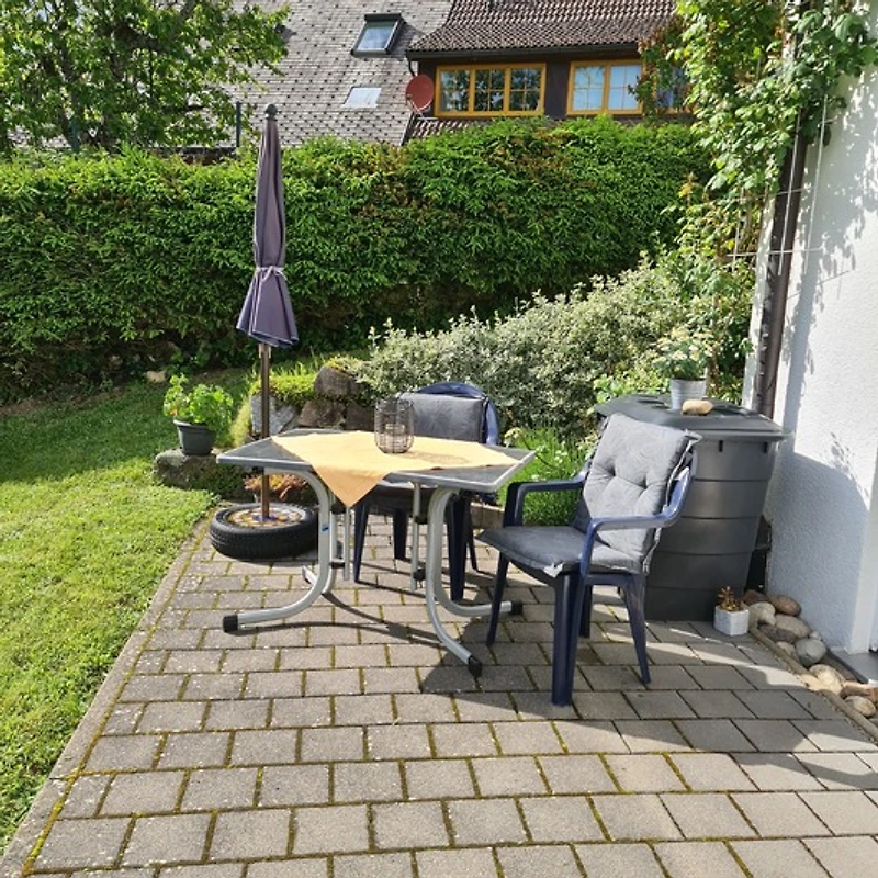 Vor der Wohnung lädt auf der Sonnenterrasse eine Sitzgruppe mit wunderschöner Aussicht zum draussen verweilen ein.