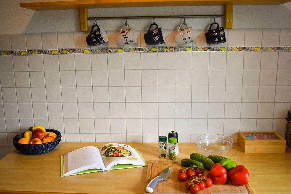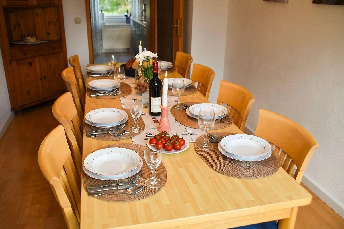Grosser Flur, Küche mit angrenzendem Essbereich für bis zu 8 Gäste. Ausgestattet ist die Küche z.B. mit einem Geschirrspüler, einer Mikrowelle, einem Toaster, einem Wasserkocher, einem Kühlschrank, einer Filterkaffeemaschine, einem modernen Cerankochfeld. Jede Menge Stauraum ist vorhanden.