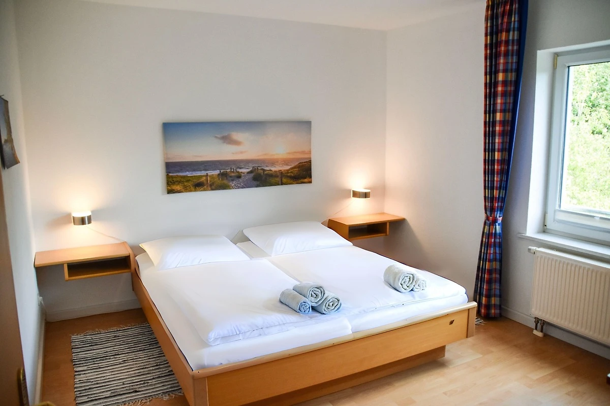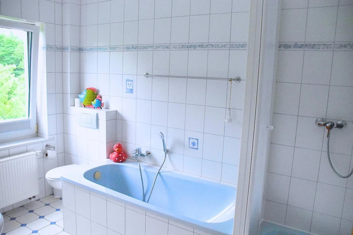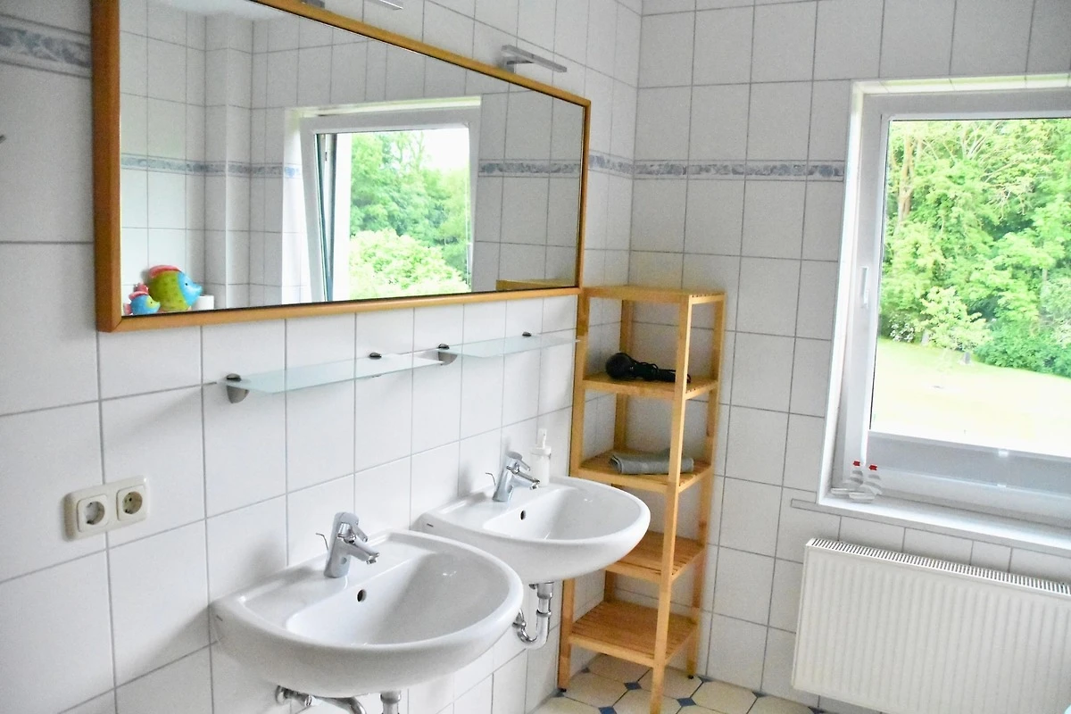 Auf dieser Etage gibt es ein geräumiges Elternschlafzimmer mit 2 Einzelbetten (90 x 200 cm) und einem Etagenbett (90x200cm). Ein weiteres Elternschlafzimmer ( Doppelbett 180x200 cm) mit Blick in den Garten Richtung Parkanlage "Brunnenaue". Ein weiteres Schlafzimmer für weitere 2 Gäste (Doppelbett 180x200 cm). Auch haben Sie auf dieser Etage ein grosses Bad mit Badewanne, Dusche, zwei Waschbecken und Fön zur Verfügung. Alle Wohn- und Schlafzimmer haben Fenster mit Sicht- und Insektenschutz.