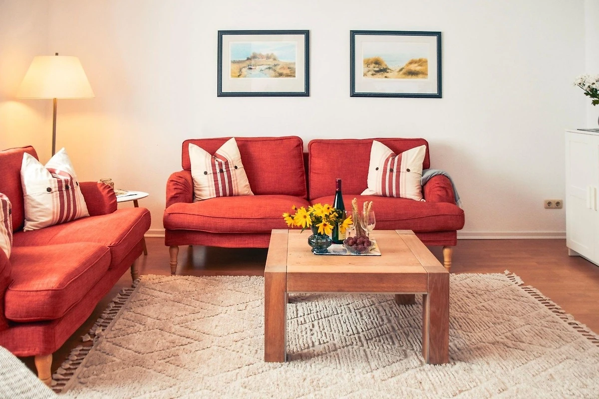 Drei separate Schlafzimmer, ein grosser Wohnbereich mit angrenzendem separatem Esszimmer, Einbauküche, Badezimmer und Gäste-WC, Hauswirtschaftsraum mit Waschmaschine, WLAN, Garten mit Strandkorb und Loungemöbeln, Grillplatz, kostenlose Autostellplätze vor dem Haus und eine abschliessbare Garage für Fahrräder.