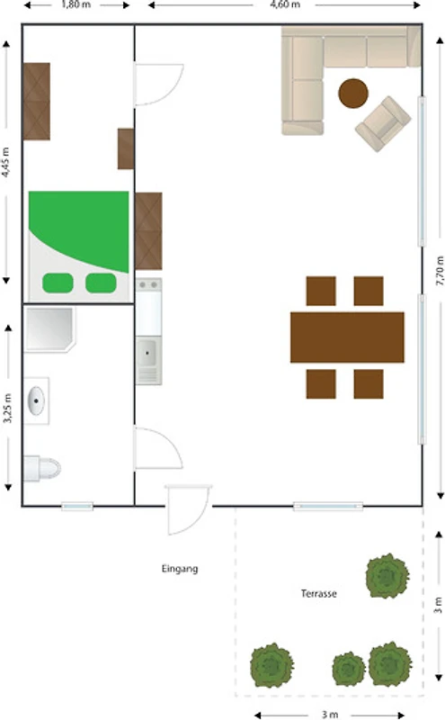 Das grosse Wohn-/Esszimmer mit Küchenzeile und Fensterfront zum Hafen erlaubt an allen Tagen das Gefühl, direkt mit dem Meer verbunden zu sein. Ausgestattet mit Kühlschrank, Wasserkocher, Kaffeemaschine, Kochfeld und Spüle lassen sich hier auch längere Aufenthalte angenehm verbringen. Das kleine Schlafzimmer ist ausgestattet mit Doppelbett, Kleiderschrank und Kommode. Weitere Gäste können auf dem Schlafsofa im Wohnbereich übernachten. Das Duschbad ist ebenfalls neu und durch ein grosses Fenster sehr hell und luftig. Von der Terrasse aus kann man immer gut Schiffe gucken und die frische Luft geniessen.