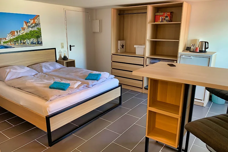 Die Zimmer sind eingerichtet mit einem Kleiderschrank inklusive ausziehbarem Schuhregal und grossen Schubladen. Von der Unterkunft aus haben Sie einen schönen Blick auf die Trave und auf das Werftgeschehen, da die Unterkunft direkt vor dem Kranplatz liegt. Innerhalb der Woche werden hier Boote gekrant, was durchaus spannend sein kann, dies einmal aus direkter Nähe und ohne Gefahr zu beobachten. Ein schönes Doppelbett mit hochwertiger Matratze (zwei Härtegrade) komplettiert die Einrichtung. Im Zimmer befinden sich Kühlschrank und Wasserkocher. Eine Grundausstattung Geschirr kann ausgeliehen werden. Handtücher, Bettwäsche, Strom und Wasser sind im Preis inbegriffen.