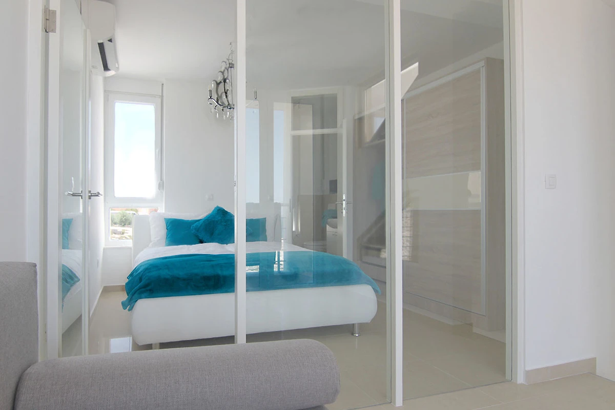 Der erste Stock ist durch eine Glaswand (mit komplettem Vorhang) mit Glastür zweigeteilt. Hinter der Glaswand befindet sich das geschmackvoll eingerichtete Schlafzimmer mit gemütlichem Doppelbett, einer Ablage und einem geräumigen Wäscheschrank mit Einbausafe. Vor der Glaswand findest du ein Sofa, welches mit wenigen Handgriffen in ein weiteres Doppelbett verwandelt wird. Hier ist auch die Balkontür und die Treppe auf die Dachterrasse.