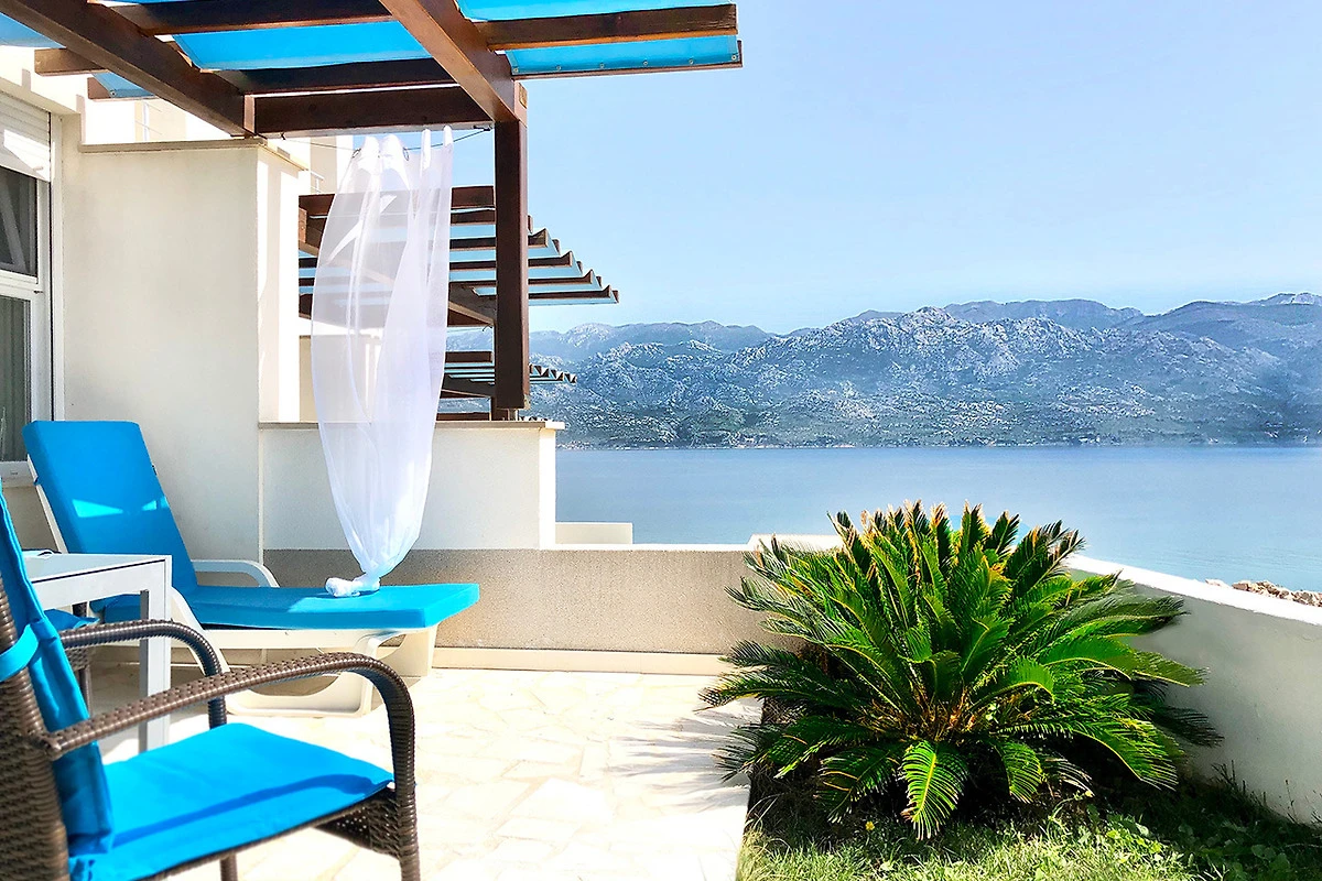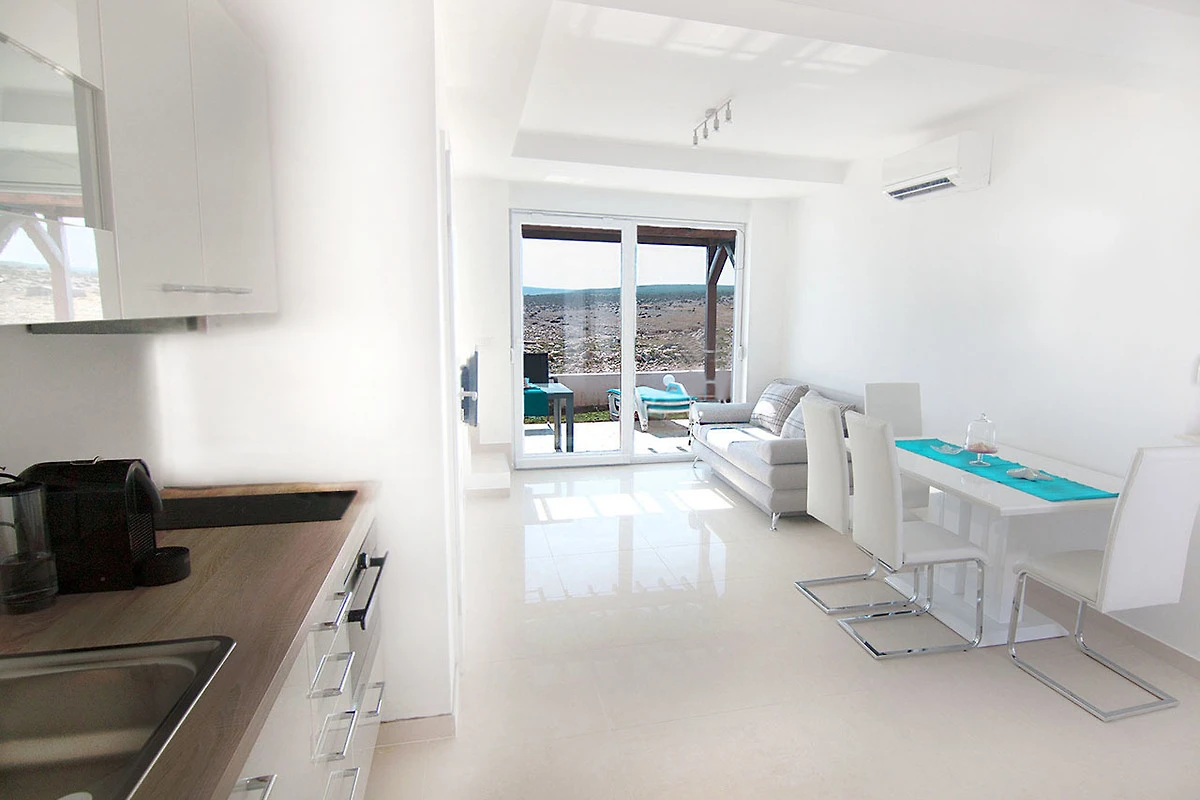 Du kannst sowohl auf der Terrasse, dem kleine Garten oder auf der grosszügigen Dachterrasse die unvergleichliche Lage geniessen. Selbst an einem der seltenen Regentage kannst du direkt vom Sofa aus durch die grosse Glasfront die spektakuläre Aussicht nutzen. Sehr oft bleiben unsere Gäste den ganzen Tag auf der Terrasse und gehen tatsächlich nur zum schwimmen an das Meer hinunter, da sie lieber in unendlicher Ruhe und Stille auf der Terrasse liegen möchten.