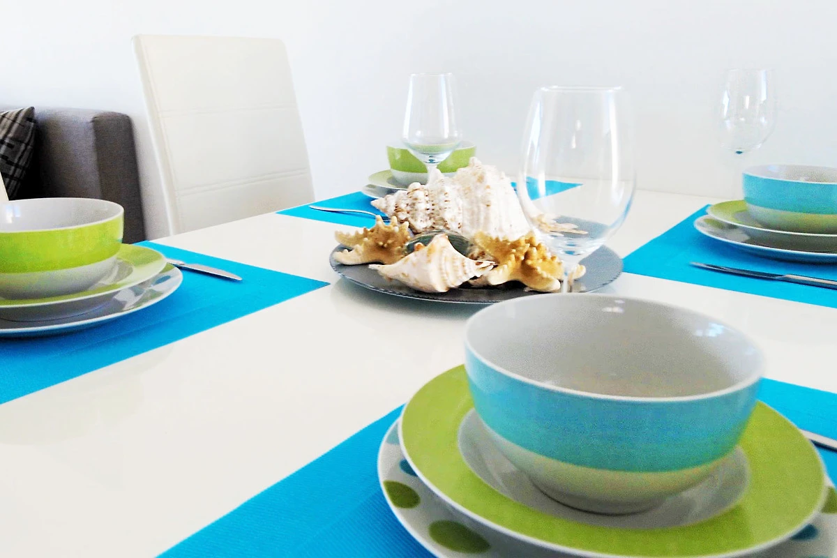 Die voll ausgestattete Küche lässt keine Wünsche offen. Jegliches Geschirr, Besteck, Töpfe, Pfannen, Dunstabzug, Ceranfeld, Backofen mit Mikrowelle, Kaffeemaschine, Kühlschrank mit Eisfach usw. sind vorhanden. Die dort zubereiteten Speisen geniesst du am besten am schönen Esszimmertisch mit direktem Blick durch die Glasfront auf das Meer und die Berge. Im hinteren Wohnbereich des Erdgeschosses chillst du auf dem Sofa mit Blick auf das Meer, den Fernseher oder in dein Buch.