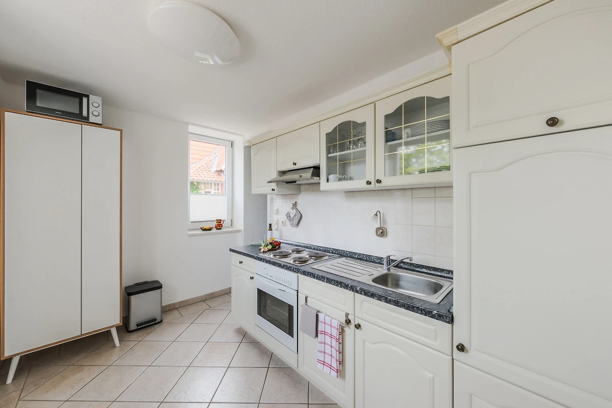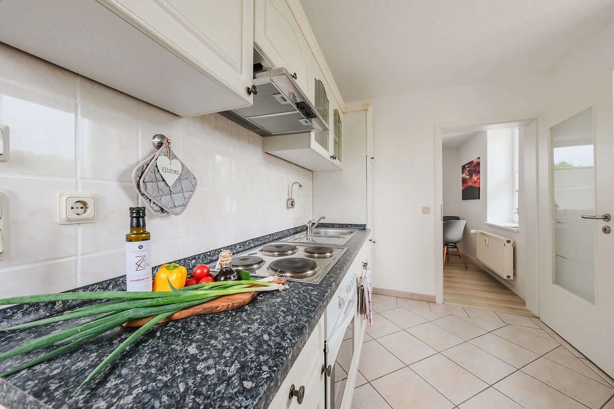 Ihre Nichtraucher-Unterkunft befindet sich Hochparterre, bietet ausreichend Platz für bis zu 4 Personen und draussen ein Plätzchen, das zum Verweilen einlädt. In den Schlafräumen, von denen einer ein Durchgangszimmer ist, finden Sie bequeme Boxspringbetten (200x200). Durch das helle Wohnzimmer mit Essplatz gelangen Sie in die Küche, die mit allem eingerichtet ist, um die Familie zu bekochen - Elektroherd mit Backofen, Kühlschrank mit Gefrierfach etc.