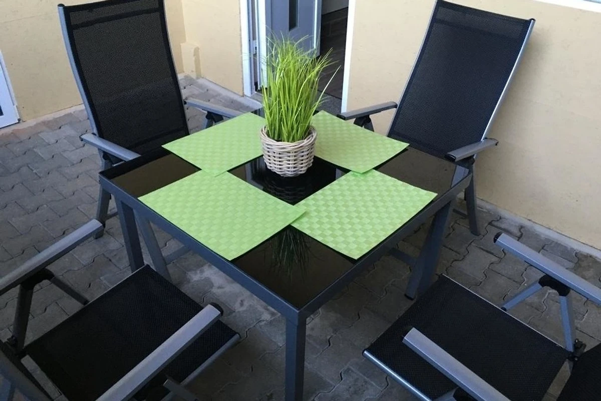 Diese Wohnung hat eine eigene Terrasse mit Tisch und Sitzgelegenheiten.