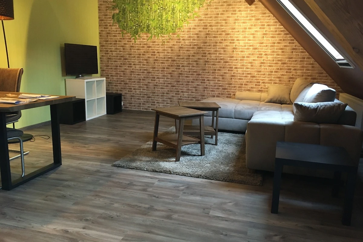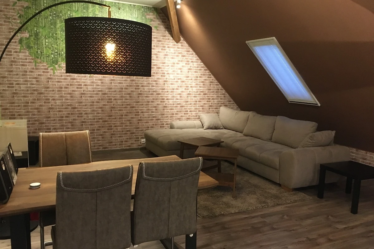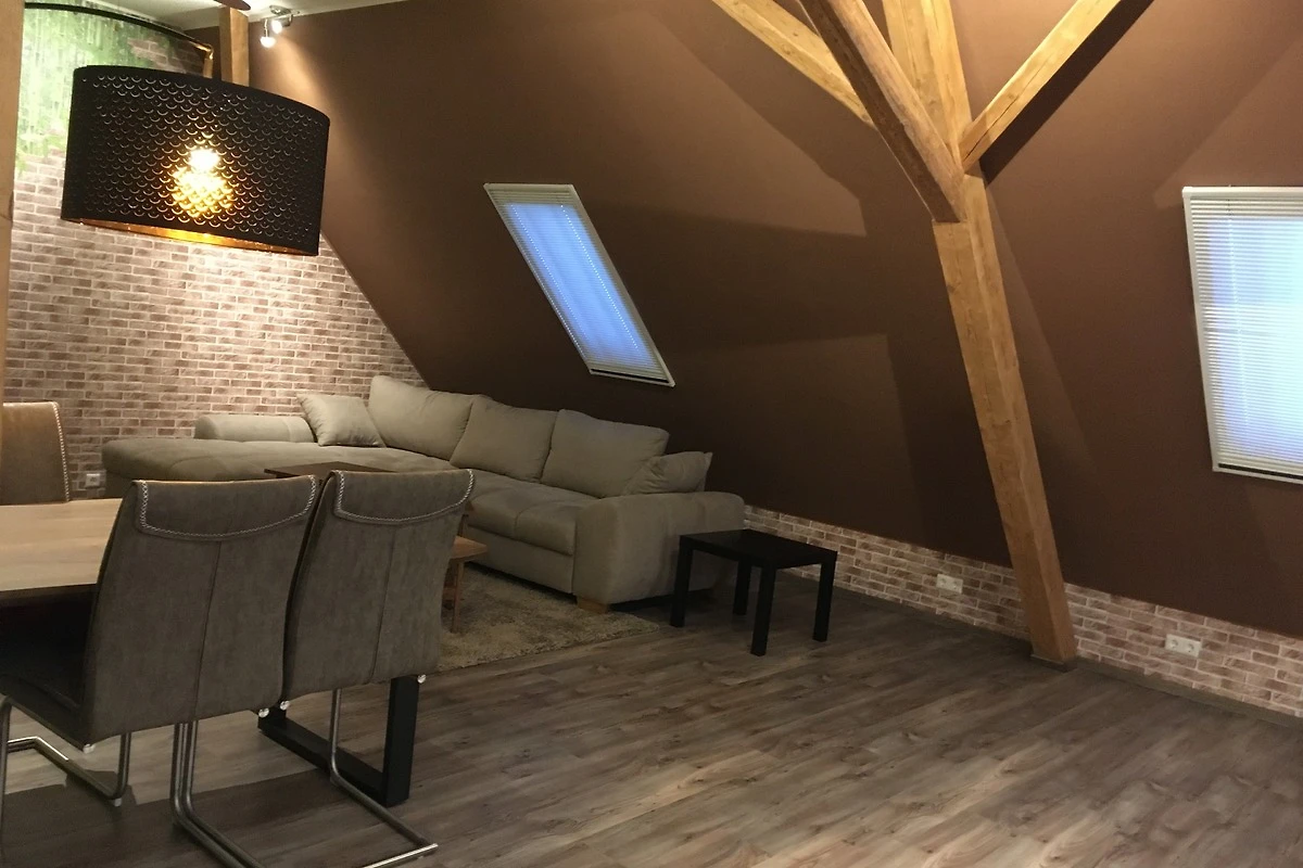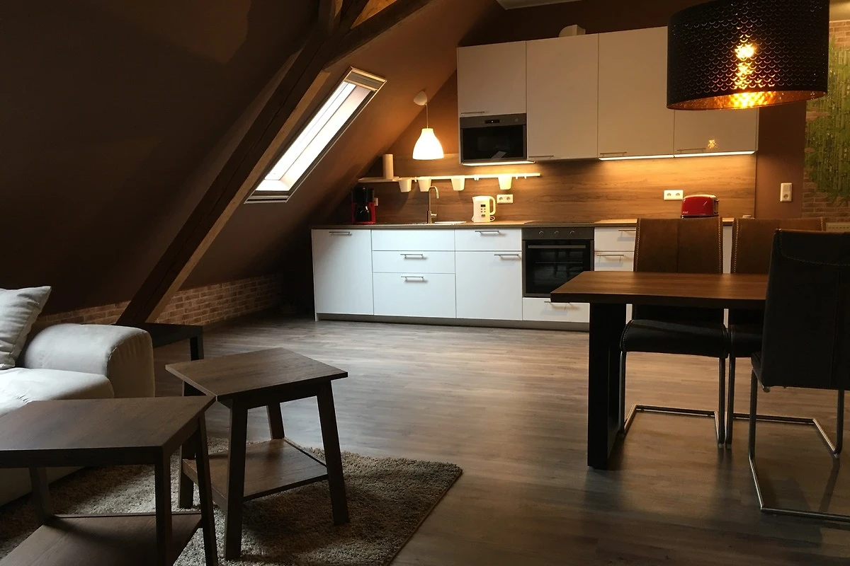 Diese Ferienwohnung liegt im Dachgeschoss. Durch die grosszügigen Deckenhöhen ist ein aussergewöhnliches luftiges Wohnerlebnis mit einem angenehmen Wohnklima entstanden.