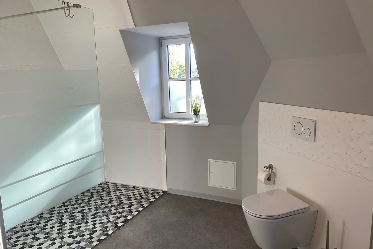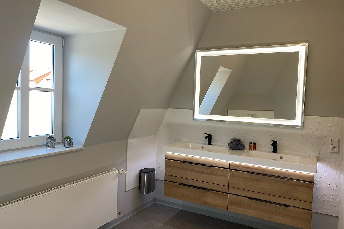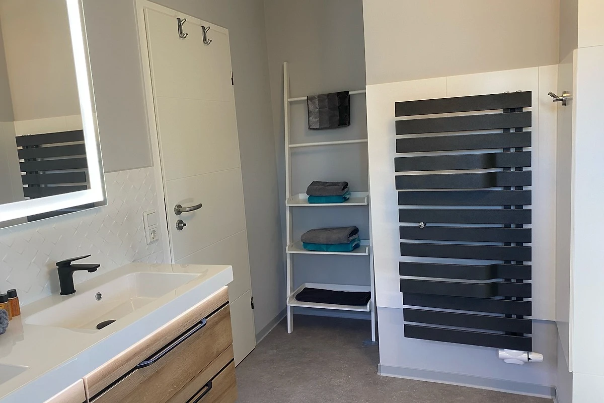 Das moderne, sehr grosszügige Tageslichtbad verfügt über eine bodengleiche Dusche, Doppelwaschtisch mit beheiztem Spiegel, WC und Handtuchheizkörper.