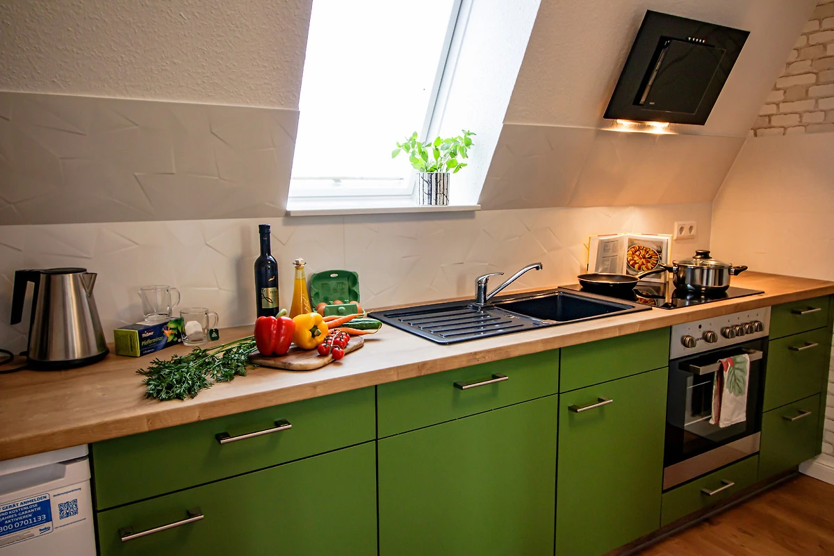 Für einen Aufenthalt von 4 Personen ist Ihre Nichtraucher-Unterkunft im zweiten OG optimal. Der Wohnbereich mit grossem Esstisch grenzt an eine moderne Küche, die mit allem eingerichtet ist, was das Herz begehrt - Ceranfeld, Backofen, Kühlschrank, Geschirrspüler etc.