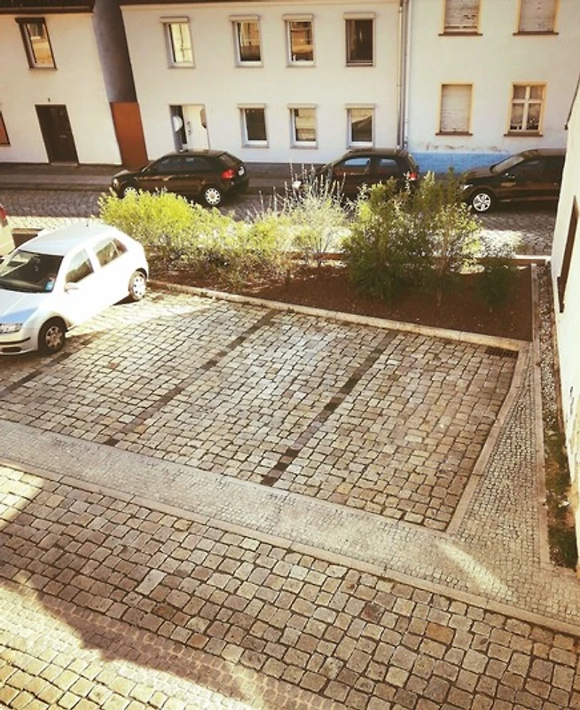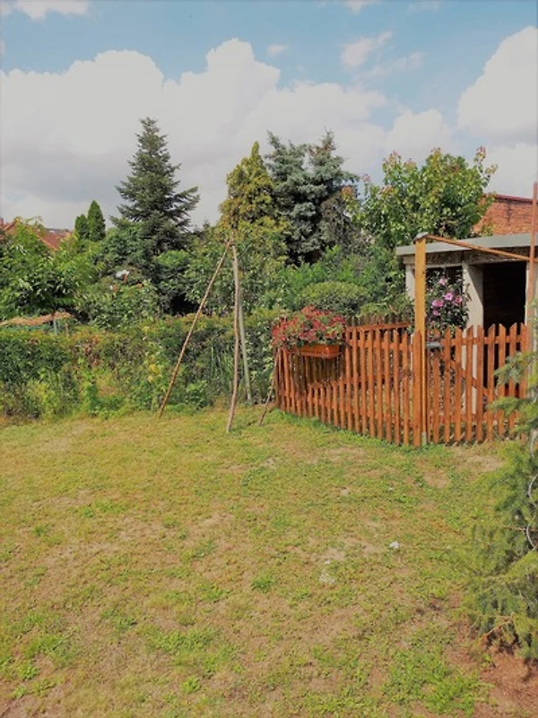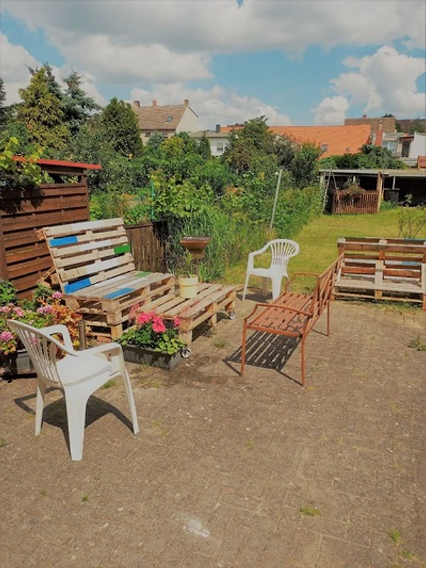 Der ruhige Garten hinter dem Haus bietet Platz zum Ausruhen, Spielen, Grillen, Abstellen von Fahrrädern oder auch Unterbringen von Haustieren. Vor dem Haus befindet sich ein öffentlicher Parkplatz.