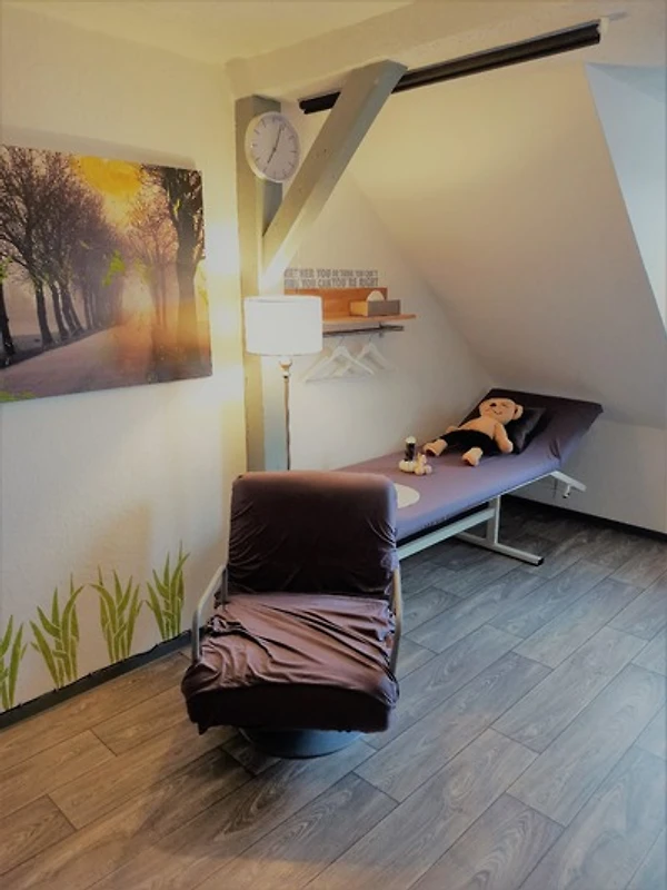 Zwischen die zwei Betten im Schlafzimmer kann ein Vorhang gezogen werden. Als weitere Schlafplätze stehen ein Ausziehsofa und ein Schlafsessel zur Verfügung. Ausserdem befindet sich im Wohnzimmer eine Massageliege.