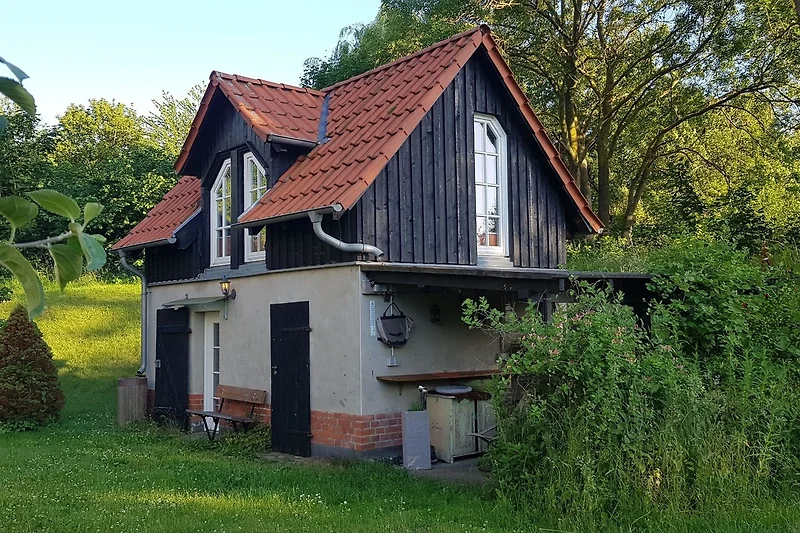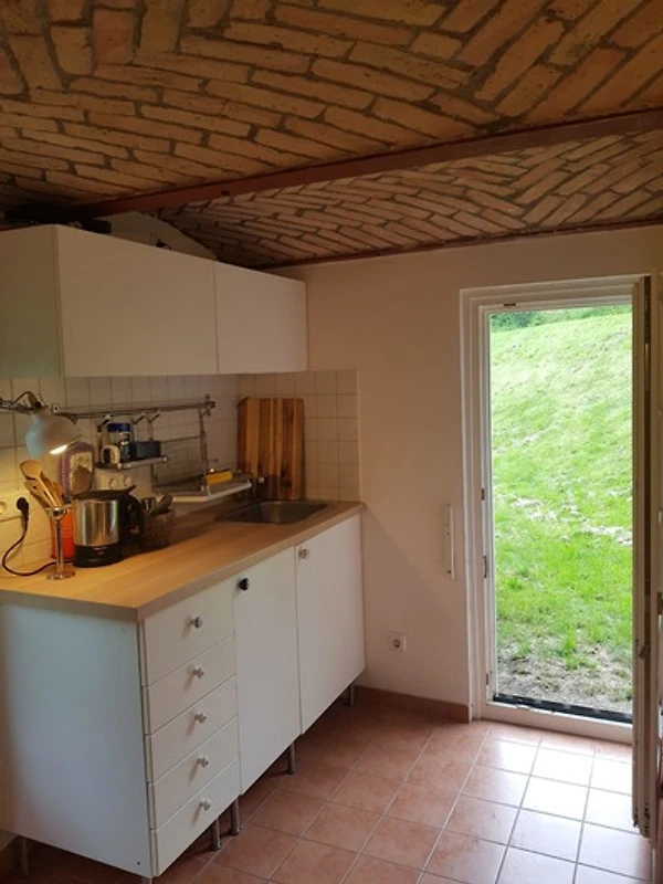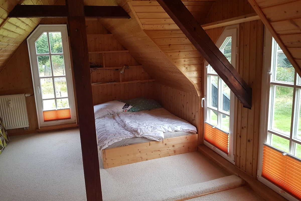 Im Erdgeschoss des liebevoll eingerichteten Hauses befinden sich eine komplett ausgestattete Küche inclusive Geschirrspüler und ein Bad mit Dusche (und natürlich Toilette und Waschbecken). Über eine recht schmale und eher steile Treppe (für Senioren möglicherweise ein Problem) gelangt man in das Obergeschoss, in dem sich der Schlafraum mit einem Doppelbett ( Breite: 1,30 Länge:1,80) befindet.