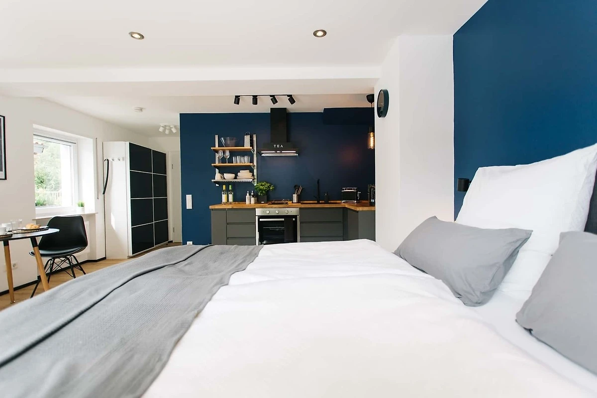Wohn-/Schlafzimmer: Box-Spring-Bett für 2 (180x200), grosser Schiebetüren-Schrank mit reichlich Platz, 42"-Smart-TV (mit Google-Chrome-Cast zum Streamen), Schreibtisch, Reisebett auf Wunsch