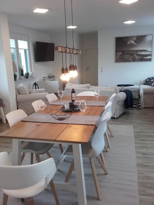 Der lichtdurchflutete Wohn- Essbereich lädt zum gemütlichen Verweilen ein. Die offen gestaltete Küche verfügt über alle Haushaltsgeräte des täglichen Bedarfs und lässt keine Wünsche offen. Geniessen Sie ein gemeinsames Essen oder entspannte Spieleabende an dem grosszügigen Tisch, an dem problemlos bis zu 8 Personen Platz finden. Die moderne Couchgarnitur sowie der 55 Zoll-Fernseher garantieren auch bei schlechtem Wetter gemütliche Stunden.