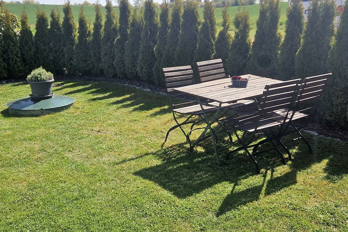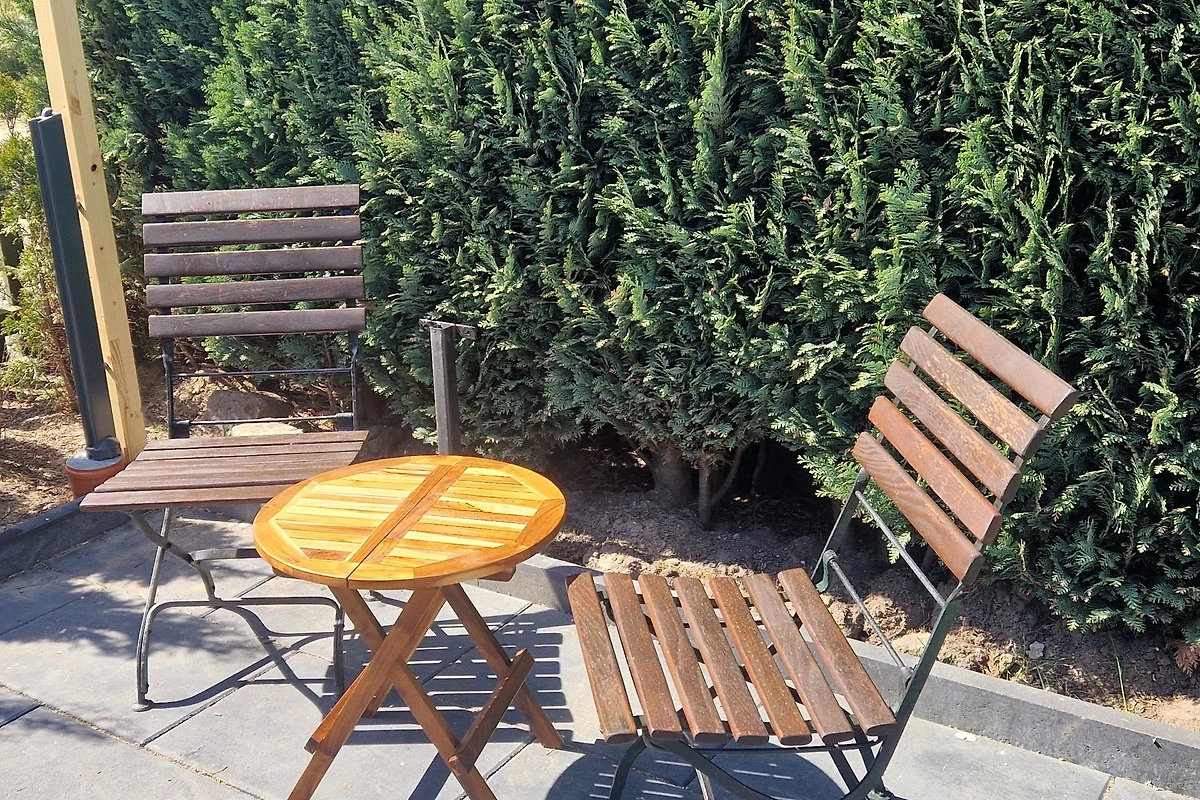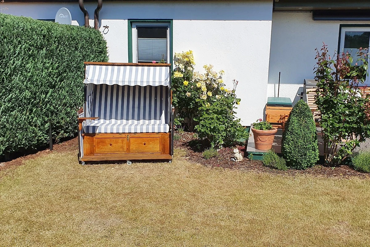 Zu dem Haus gehört eine 30 m2 grosse Terrasse mit angrenzender Rasenfläche zur alleinigen Nutzung. Die Sitzecke der Terrasse ist mit hochwertigen Teakmöbeln für 6 Personen ausgestattet. Eine elektrisch ausfahrbare Markise spendet im Sommer Schatten. 2 Sonnenliegen sowie ein Grill stehen zur Verfügung.