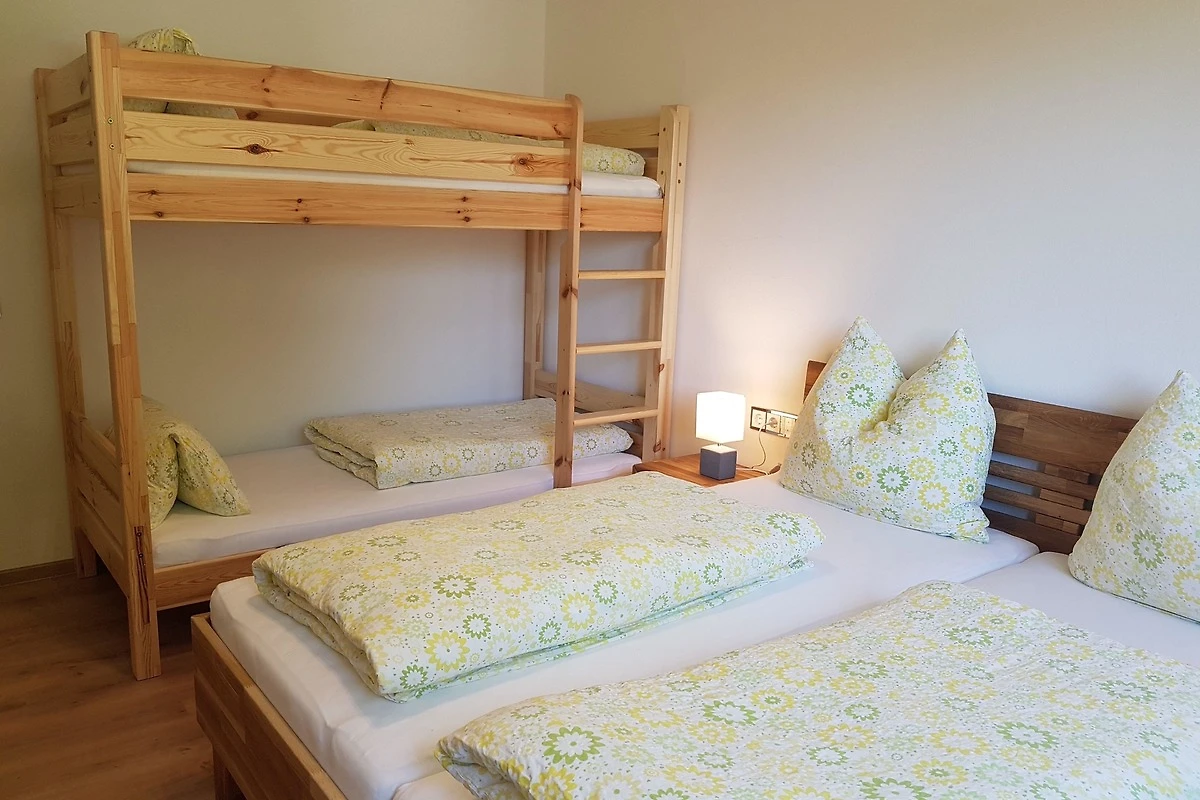 Das Apartment bietet Ihnen eine grosse und mit allen Komfort ausgestattete Wohnküche, 1 Schlafzimmer mit einem Doppelbett und Etagenbett, 1 Schlafzimmer mit Etagenbett, 1 Bad mit Dusche, WC und Waschbecken.