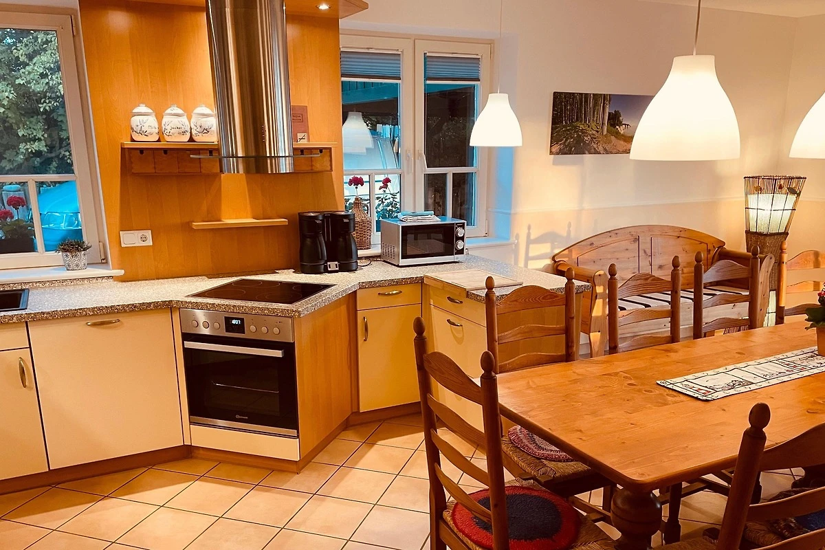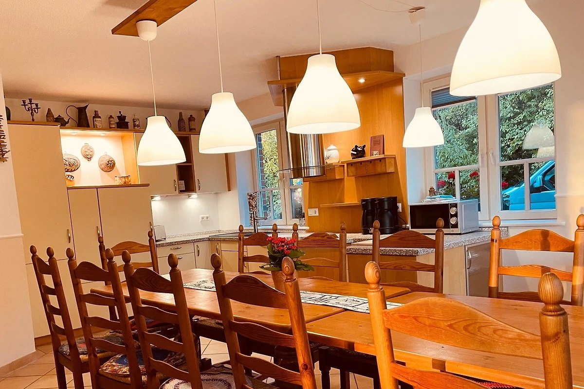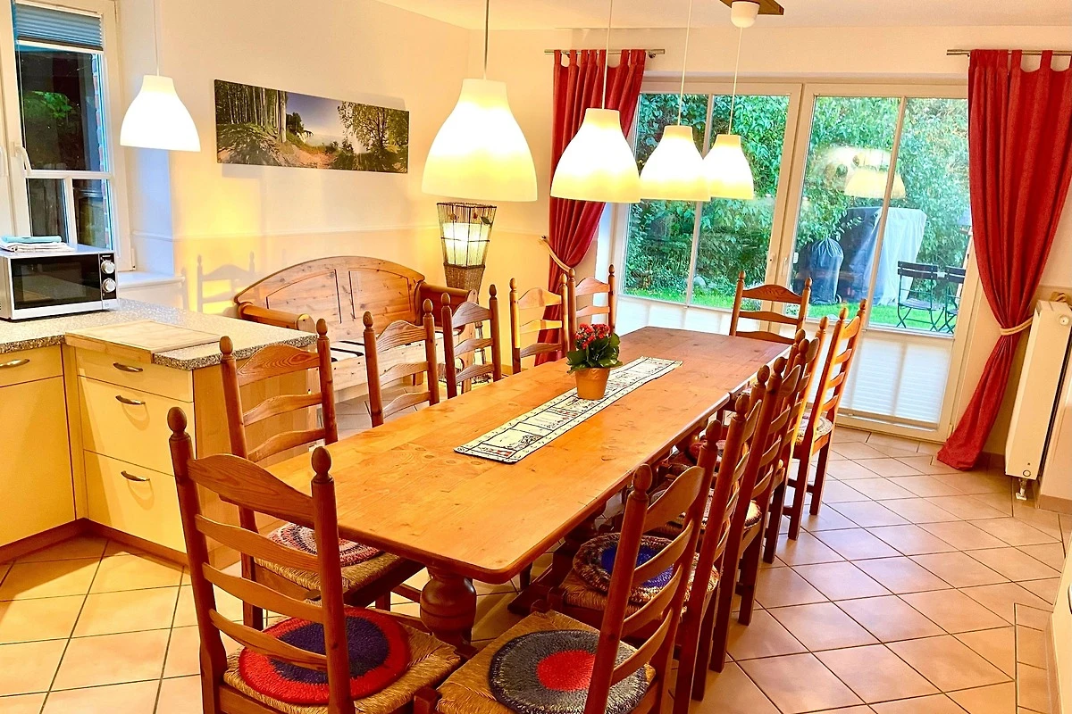 Das Erdgeschoss: Die Wohnküche hat ca 25 qm Platz und einen grossen Essbereich für bis zu 13 Gäste. Es gibt bodentiefe