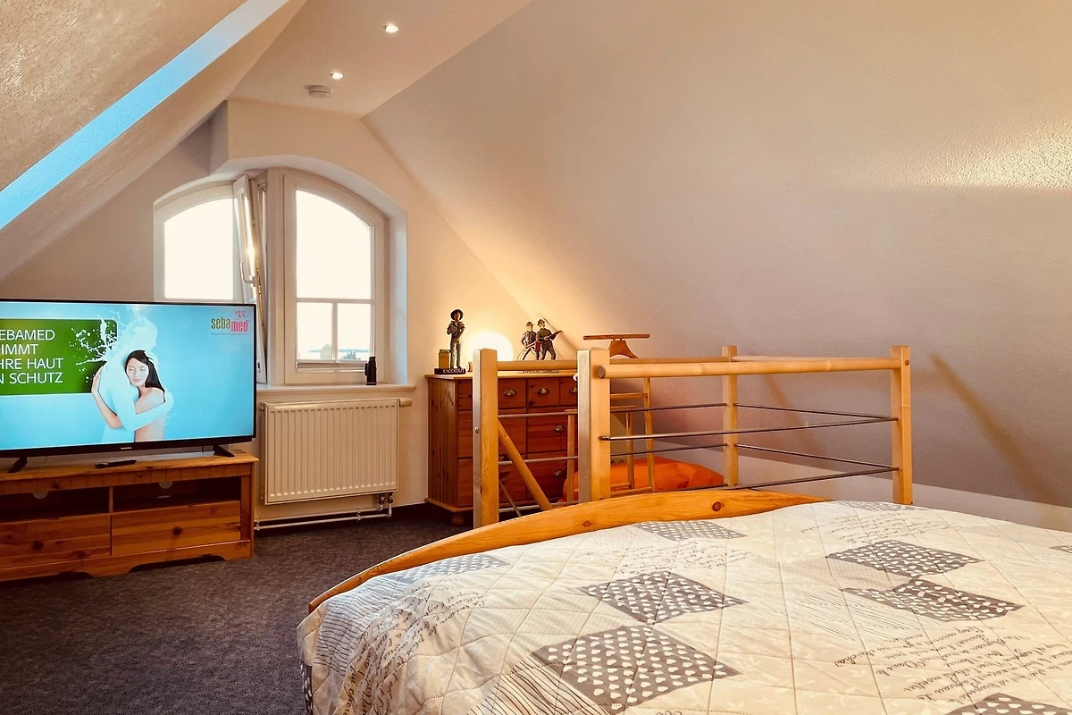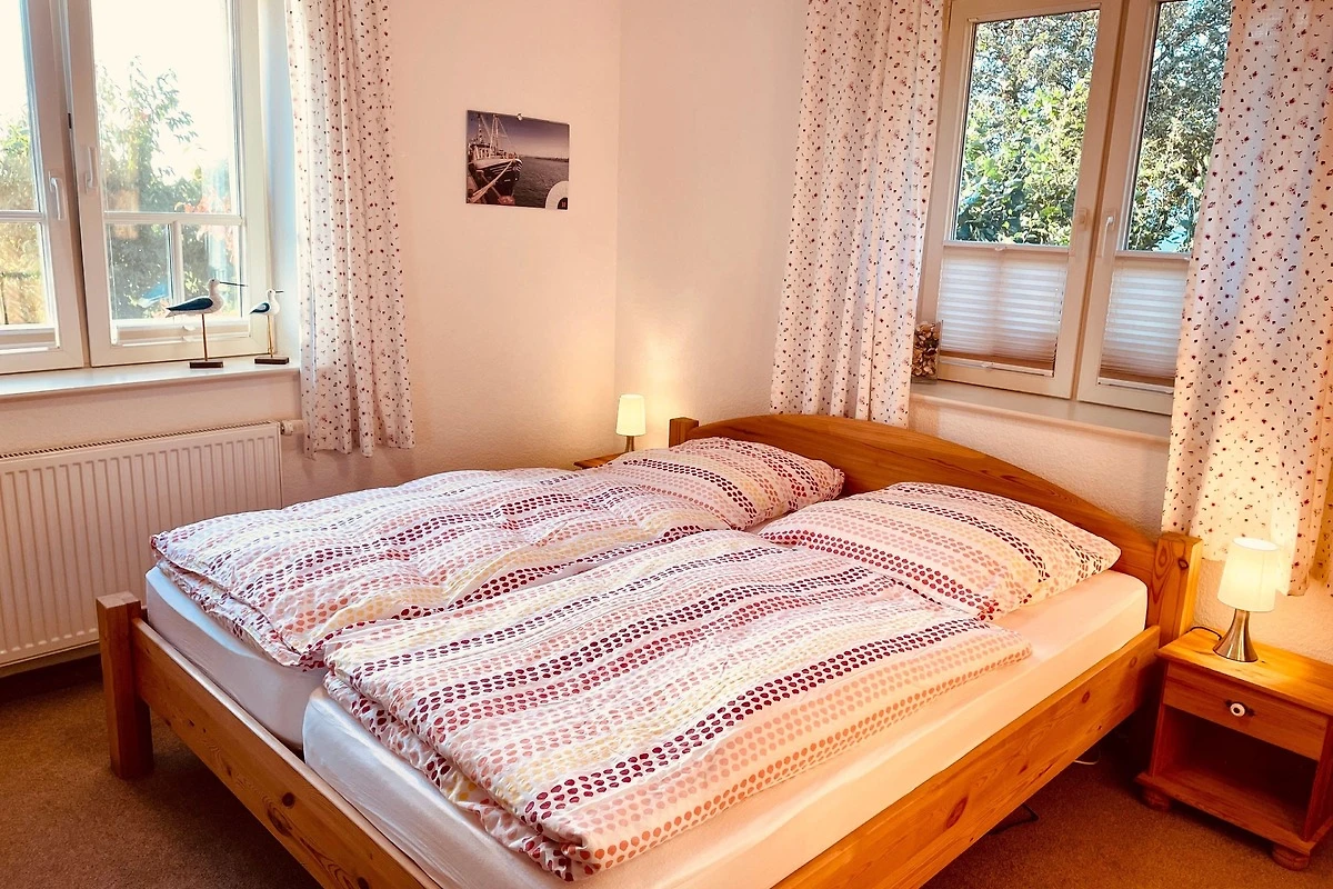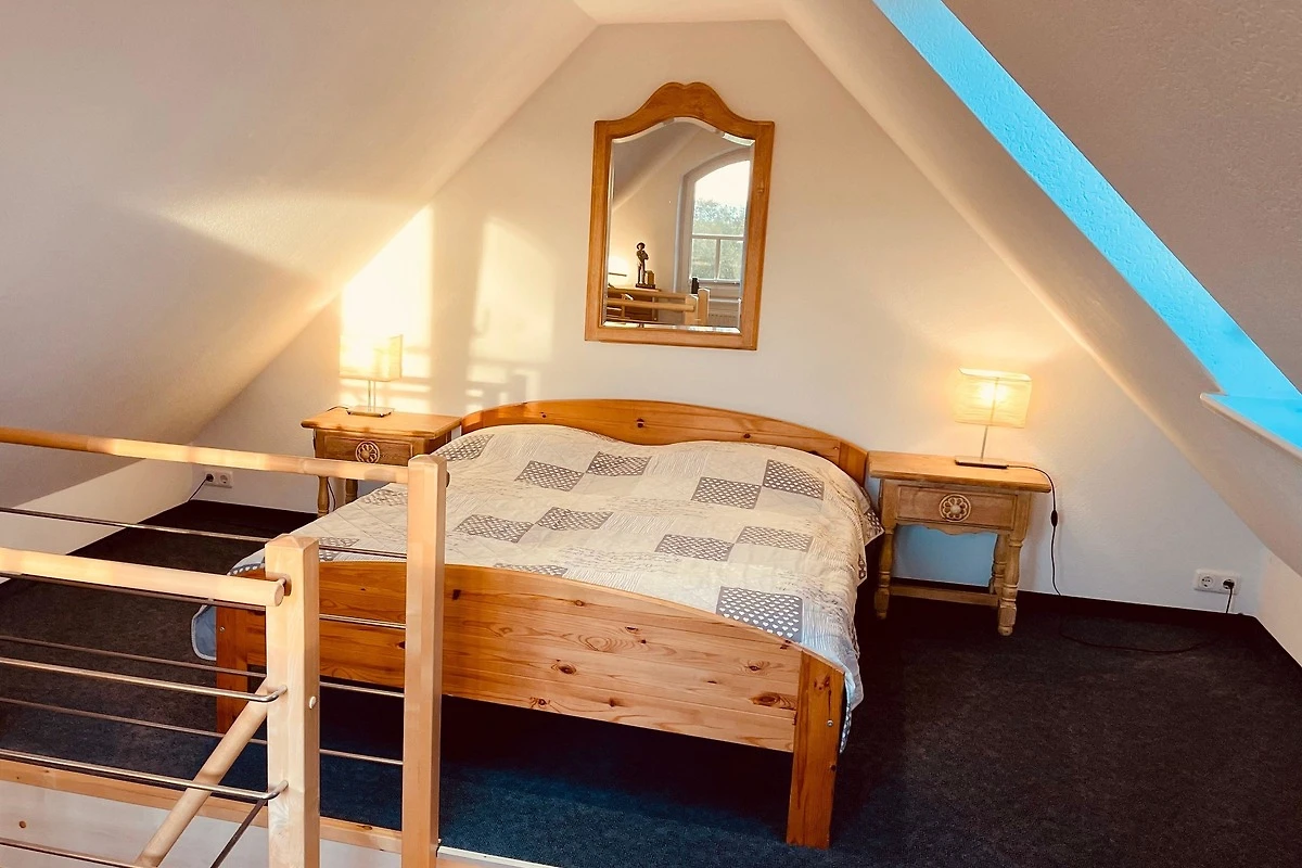 Hier finden Sie einen grossen Flur mit einer Galerie/ Leseecke und schönem Ausblick aus dem Gaubenfenster in Richtung Norden & Westen zur Insel Hiddensee. Auf dieser Etage gibt es ein geräumiges Elternschlafzimmer mit angrenzendem Juniorzimmer (Einzelbett) , dazu ein grosses Kinderschlafzimmer mit ca 13 qm. Ein weiteres Kinderschlafzimmer bietet Platz über 2 Etagen mit insgesamt 20 qm für 4 Gäste. Ausserdem haben Sie ein grosses Bad mit Badewanne, Dusche, 2 Waschbecken, ...... Alle Zimmer haben Fenster mit Insektenschutz.