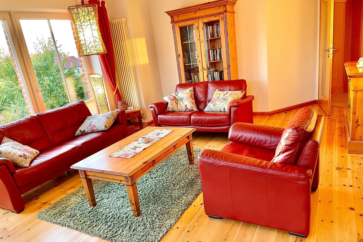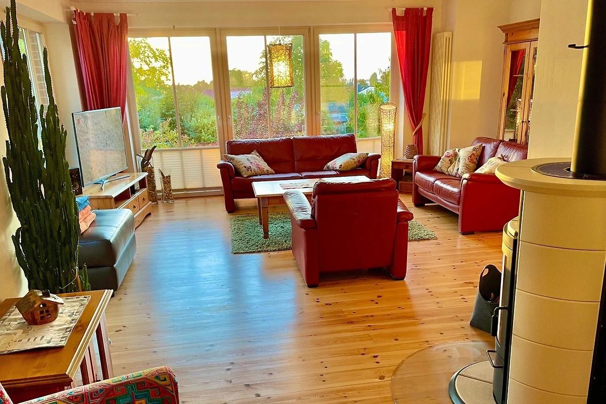 Fenster auf die Terrasse mit Blick auf den Grossen Jasmunder Bodden. Ausgestattet ist die Küche zB mit superleisem Geschirrspüler, Mikrowelle, Toaster, Wasserkocher, Kühlschrank , Doppelkaffeemaschine, sep. Tiefkühlschrank, modernem Herd mit Backofen, jede Menge Stauraum und Arbeitsfläche, etc .... Der angrenzende helle und lichtdurchflutete Wohnbereich mit bodentiefen Fenstern bietet einen tollen Blick auf Bodden, in den Garten und die angrenzenden Felder. Ausserdem gibt es viel Geräumigkeit, bequeme Sitzmöbel, 55 Zoll Smart - TV 4K, Kaminofen, ..... In diesem Geschoss finden Sie auch ein Vollbad mit Dusche und WC sowie ein ca. 15 qm grosses Elternschlafzimmer mit 1,80er Doppelbett; grossen Flur mit separater Garderobe.