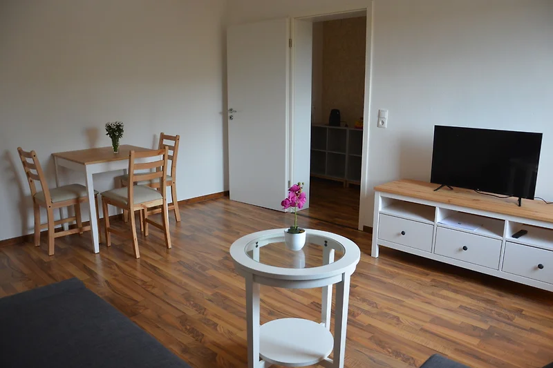 Die Ferienwohnung befindet sich im ersten Obergeschoss und verfügt neben einem Wohnzimmer, Schlafzimmer und Bad auch über eine kleine Teeküche.